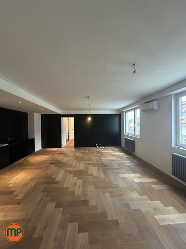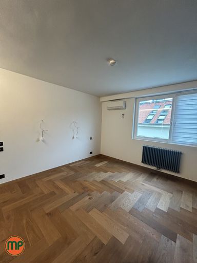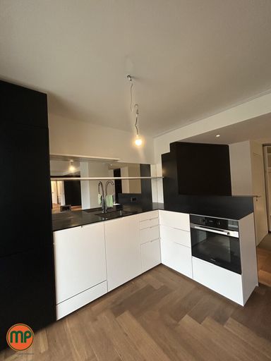 Von dort gelangt man in die großzügige Wohnküche, die das Herzstück der Wohnung bildet. Die Therme und der Warmwasserboiler sind elegant verdeckt, sodass sich ein harmonisches Gesamtbild ergibt. Der edle Parkettboden unterstreicht das hochwertige Ambiente.