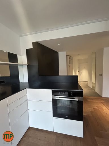 Die maßgefertigte Küche überzeugt mit modernem Stil und erstklassiger Ausstattung – Geräte von Miele und Siemens überzeugen mit ihrer Leistung. Die schwarzen Oberflächen verleihen der Küche eine zeitlos elegante Note, während maßgeschneiderte Einbauschränke nahtlos im Raumkonzept aufgehen. Selbst die Heizkörper fügen sich farblich perfekt in das moderne, stilvolle Gesamtbild ein.