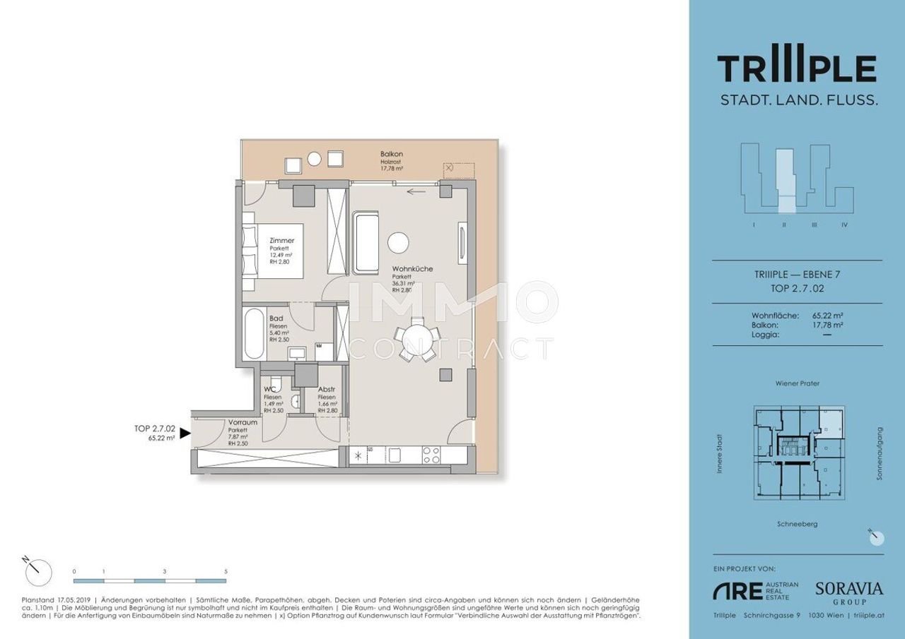 Leben im TrIIIple mit vielen Annehmlichkeiten, wie ein Pool am Dach Der intelligente und durchdachte Grundriss macht dieses geräumige 2-Zimmer-Apartment zur optimalen Startwohnung für Singles, junge Pärchen oder Studenten. Raumhohe Fenstertüren verbinden den Innenraum elegant mit den Freiflächen und vermitteln ein helles, offenes Wohngefühl. Die Wohnung bietet einen knapp 18 m² großen Balkon mit direktem Blick auf den grünen Prater. Bei der Ausstattung wurde Wert auf höchste Qualität und anspruchsvolles Design gelegt: Echtholz-Parkettböden und Feinsteinzeug sorgen für eine hochwertige Optik, Fußbodenheizung & Fußbodenkühlung (ab dem 11. Stockwerk), Sicherheitstüre & Videogegensprechanlage runden die moderne Ausstattung ab. TrIIIple steht für Nachhaltigkeit und...