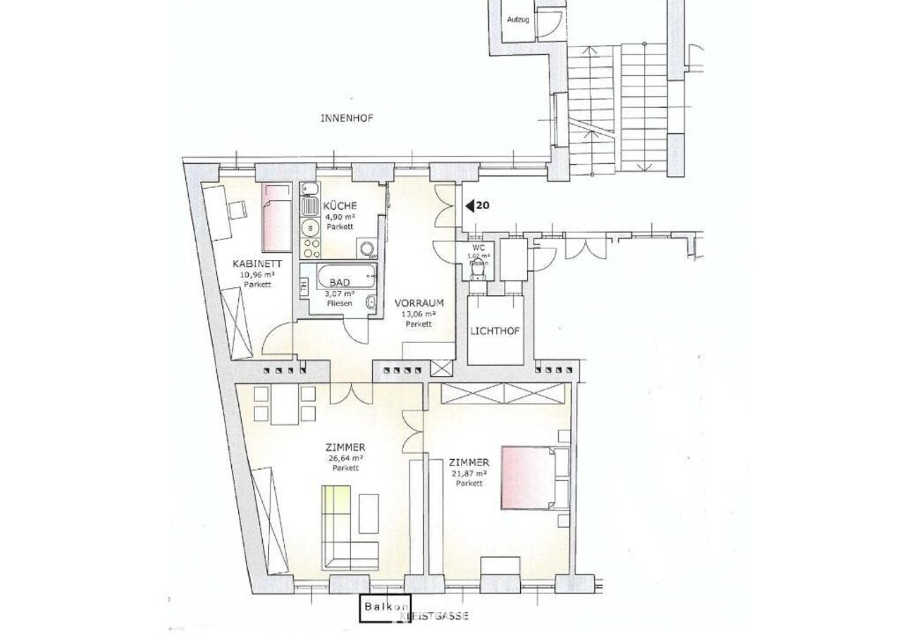 So liegt diese Wohnung in der Kleistgasse, ein kleiner Teil, der nicht befahrbar ist, da sich gegenüber des Hauses eine Volksschule befindet. Am Wochenende und in den Ferien absolute Ruhe, ansonst hört man die kindlichen Stimmen zu Stundenbeginn- und ende!