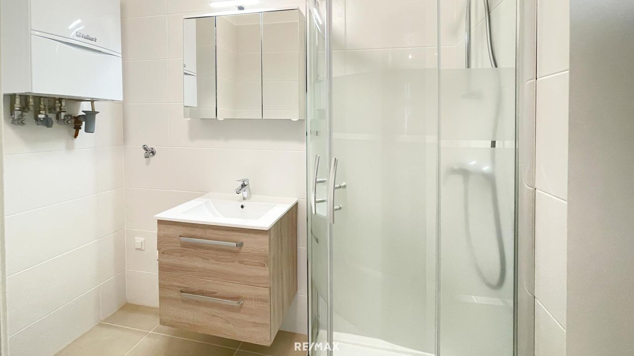 - Neuwertiges Bad mit Waschbecken, Dusche, Waschmaschinenanschluß