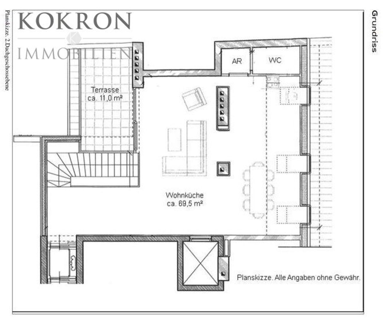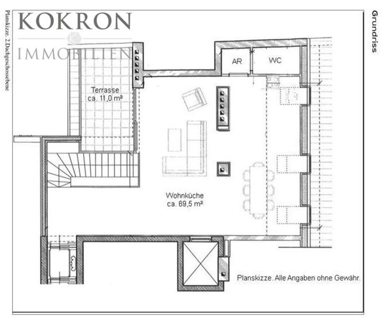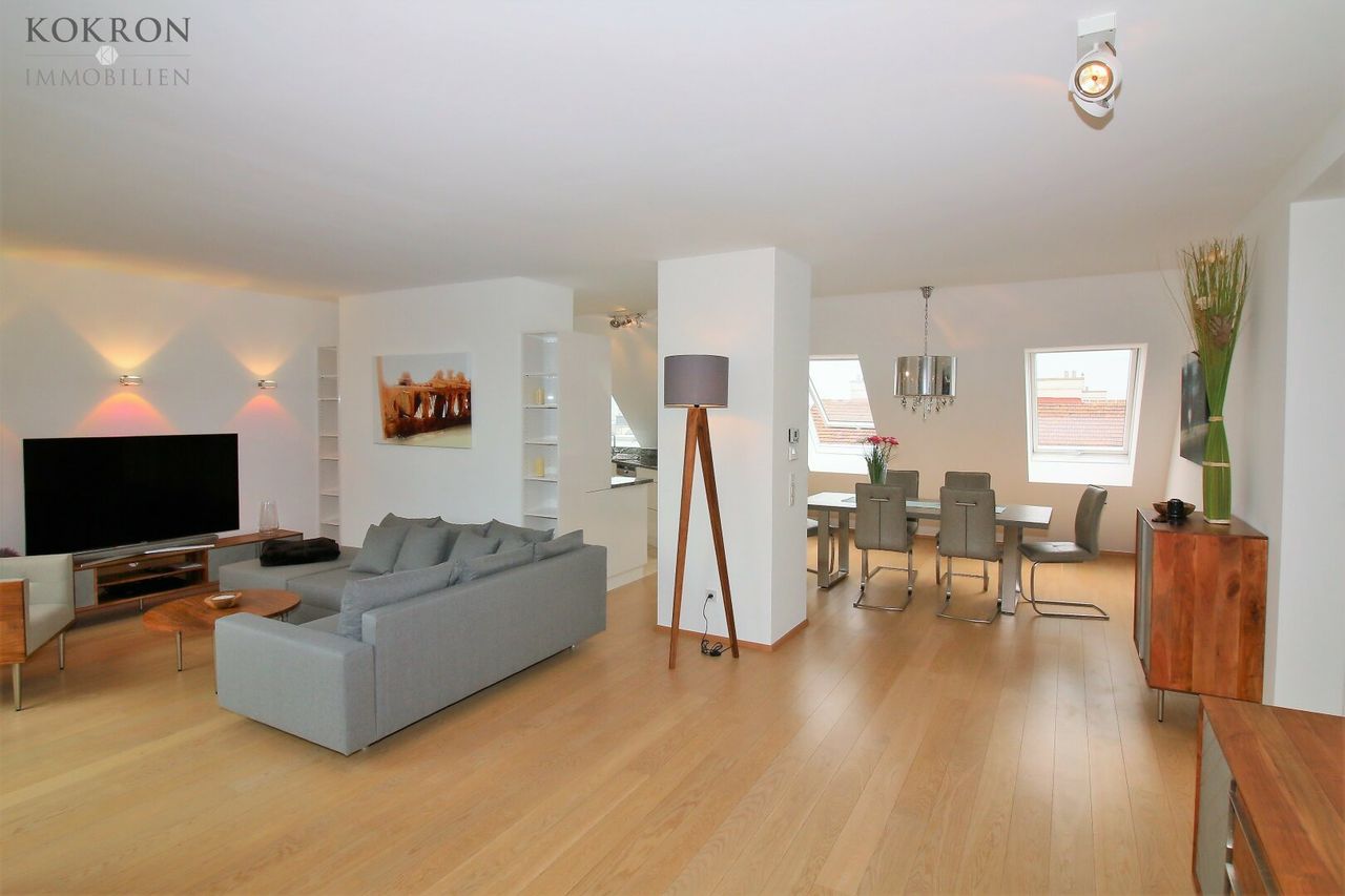 Über einen privaten Liftzugang gelangt man direkt in das 2. DG mit ca. 70m² Wohnsalon mit angrenzender rund 11m² Terrasse und einer offenen, vollausgestatteten Marken-Küche inkl. Weinkühlschrank.