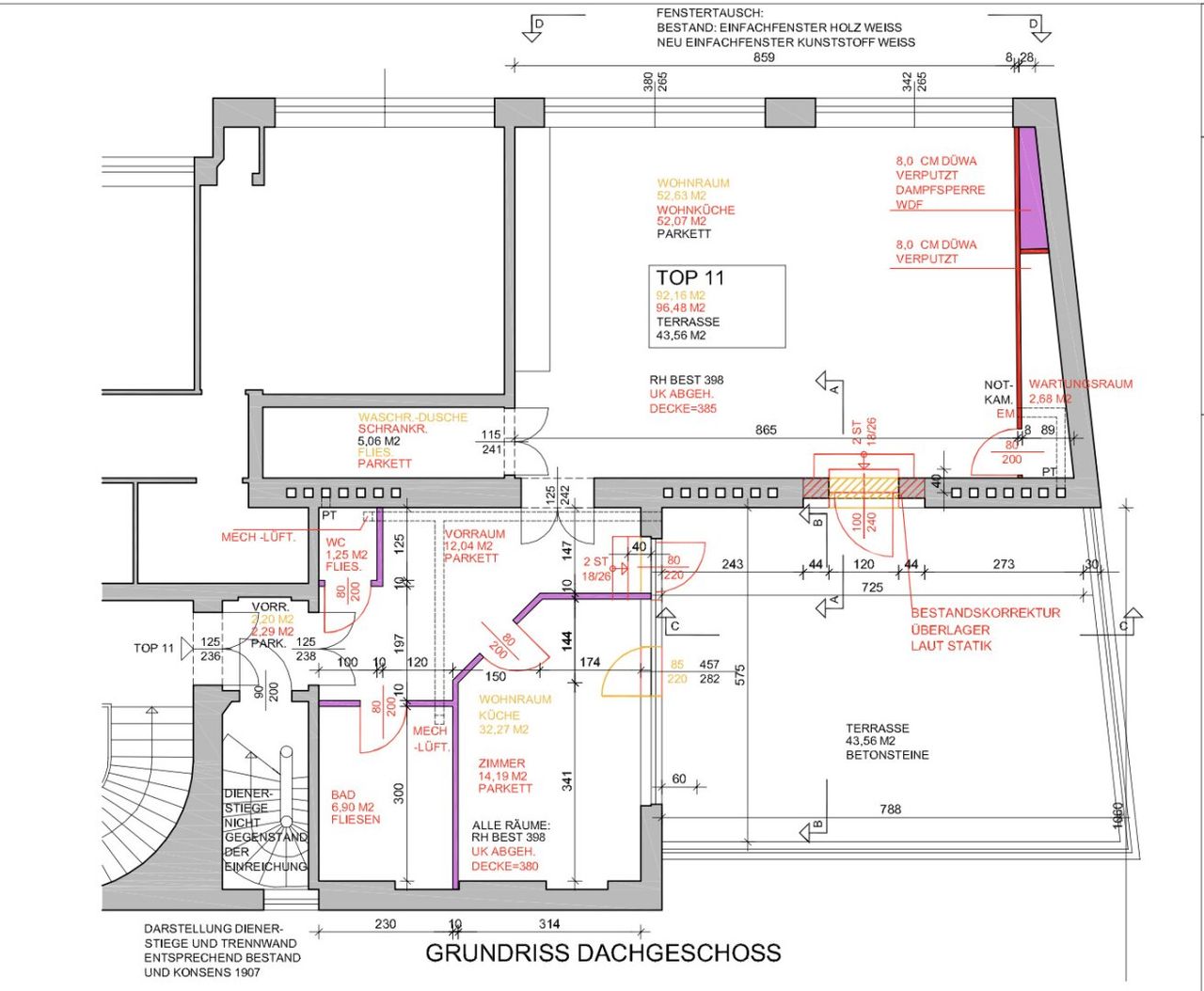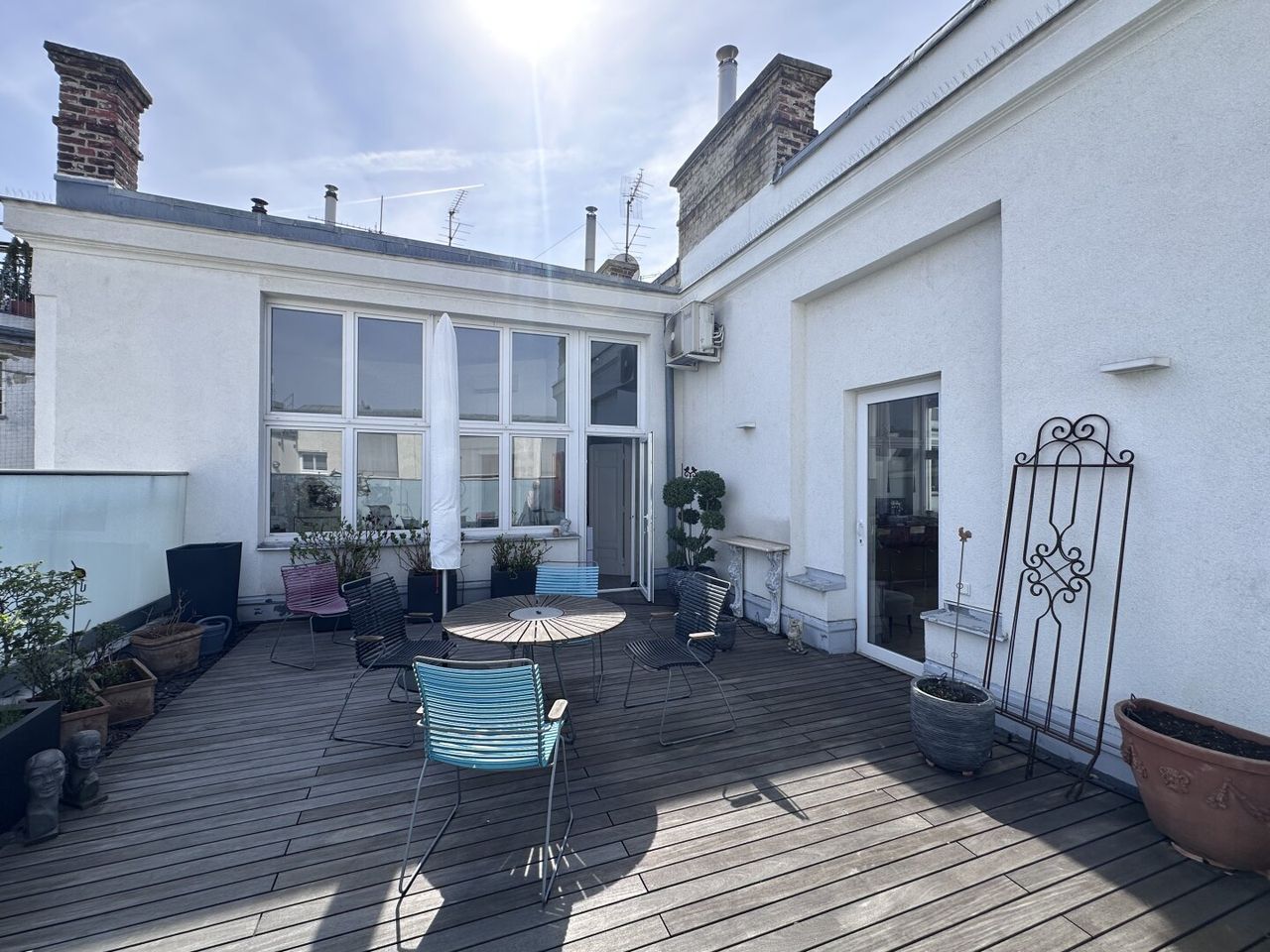 Sowohl vom Wohnzimmer als auch vom Vorraum aus gelangen Sie auf die beeindruckende, ca. 43 m² große Dachterrasse. Diese wurde mit viel Liebe zum Detail gestaltet und gepflegt und bietet eine perfekte Oase zum Entspannen. Viele der dort befindlichen Elemente können ebenfalls gegen Ablöse übernommen werden – Details dazu gerne im Rahmen einer Besichtigung.