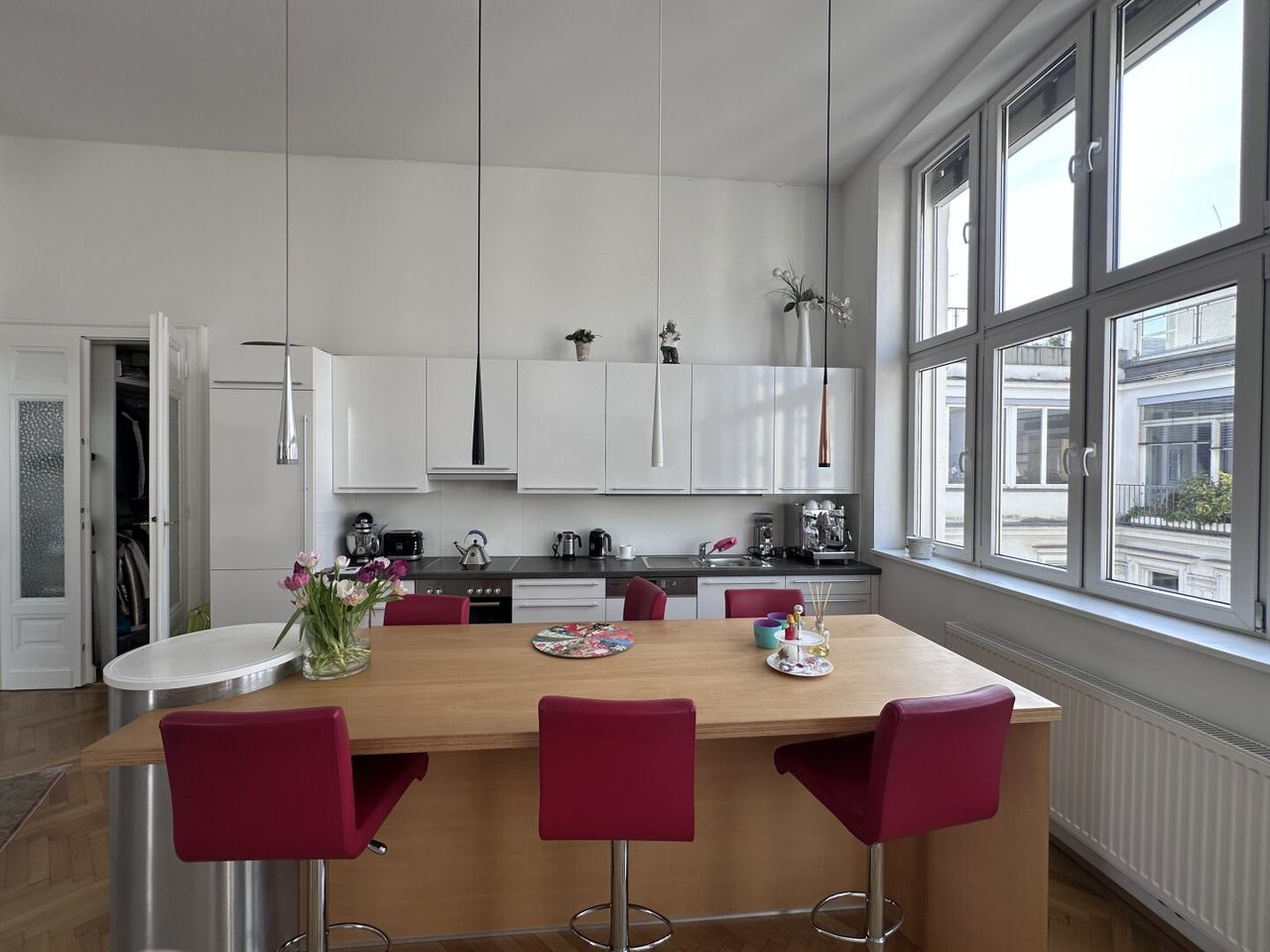 Das Herzstück der Wohnung bildet jedoch das großzügige, rund 52 m² große Wohnzimmer mit integrierter Wohnküche. Dieser lichtdurchflutete Raum bietet ein unvergleichliches Wohngefühl und vielfältige Gestaltungsmöglichkeiten. Die derzeitige Mieter*in hat hier eine moderne Kücheninsel mit Sitzgelegenheiten integriert, die bei Interesse gegen Ablöse übernommen werden kann. Zusätzlich befindet sich auf der linken Seite ein länglicher, knapp 5 m² Raum, der sich ideal als begehbarer Kleiderschrank nutzen lässt. Ein weiterer, praktischer Abstellraum am Ende des Wohnzimmers sorgt für zusätzlichen Stauraum.