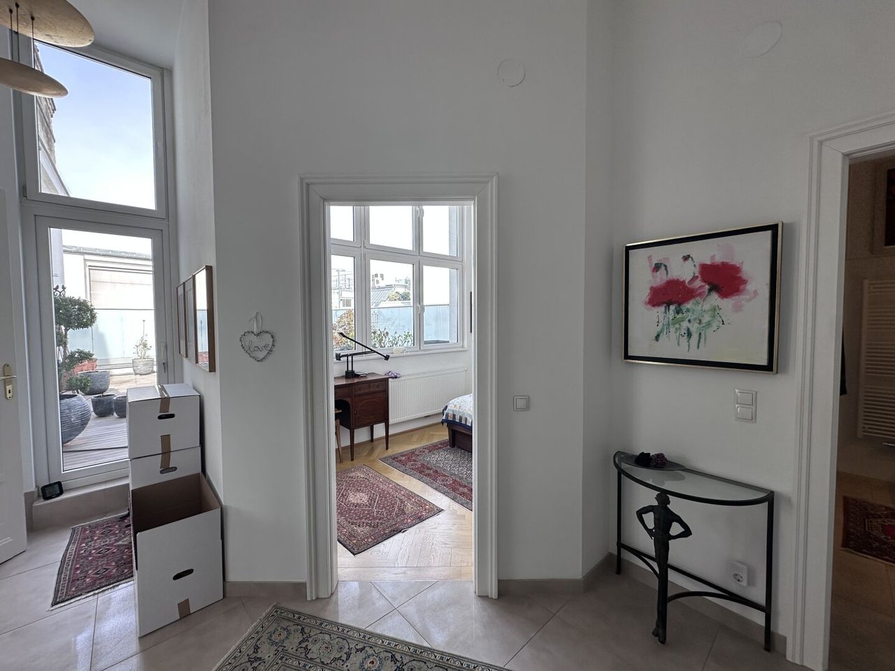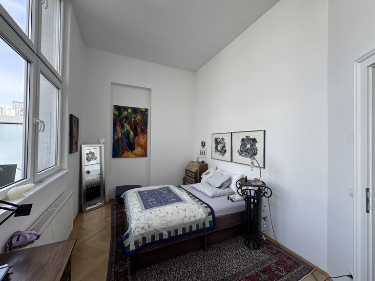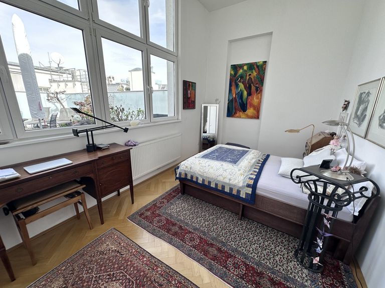 Weiter gelangen Sie in ein ca. 14 m² großes Zimmer, das sich hervorragend als Schlafzimmer eignet. Es überzeugt nicht nur durch seine angenehme Größe, sondern auch durch den Blick auf die beeindruckende Dachterrasse.
