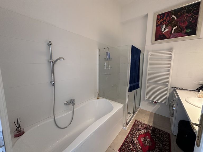 Von hier aus öffnet sich der einladende Vorraum, der Sie harmonisch in alle Bereiche der Wohnung führt. Gleich zu Ihrer Linken befindet sich ein separates WC mit Handwaschbecken. Auf der rechten Seite erwartet Sie das elegant ausgestattete Badezimmer: eine Kombination aus großzügiger Dusche und Badewanne, ergänzt durch ein Doppelwaschbecken mit langem Spiegel. Ein besonderes Extra bietet die integrierte Infrarot-Deckenheizung, die vor allem an kühleren Tagen für angenehme Wärme nach dem Duschen sorgt.