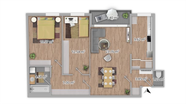 Die Raumstruktur überzeugt durch Funktionalität und Wohnqualität: Ein großzügiger Wohnbereich, Schlafzimmer sowie ein Kabinett (ideal als Kinder-, Gäste- oder Arbeitszimmer) bieten flexible Nutzungsmöglichkeiten. Die Wohnküche rundet das stimmige Raumkonzept ab. Eine untergeordnete Nutzung als eigenes Büro ist – bei überwiegender Wohnnutzung – möglich und eignet sich ideal für Homeoffice ohne Parteienverkehr.