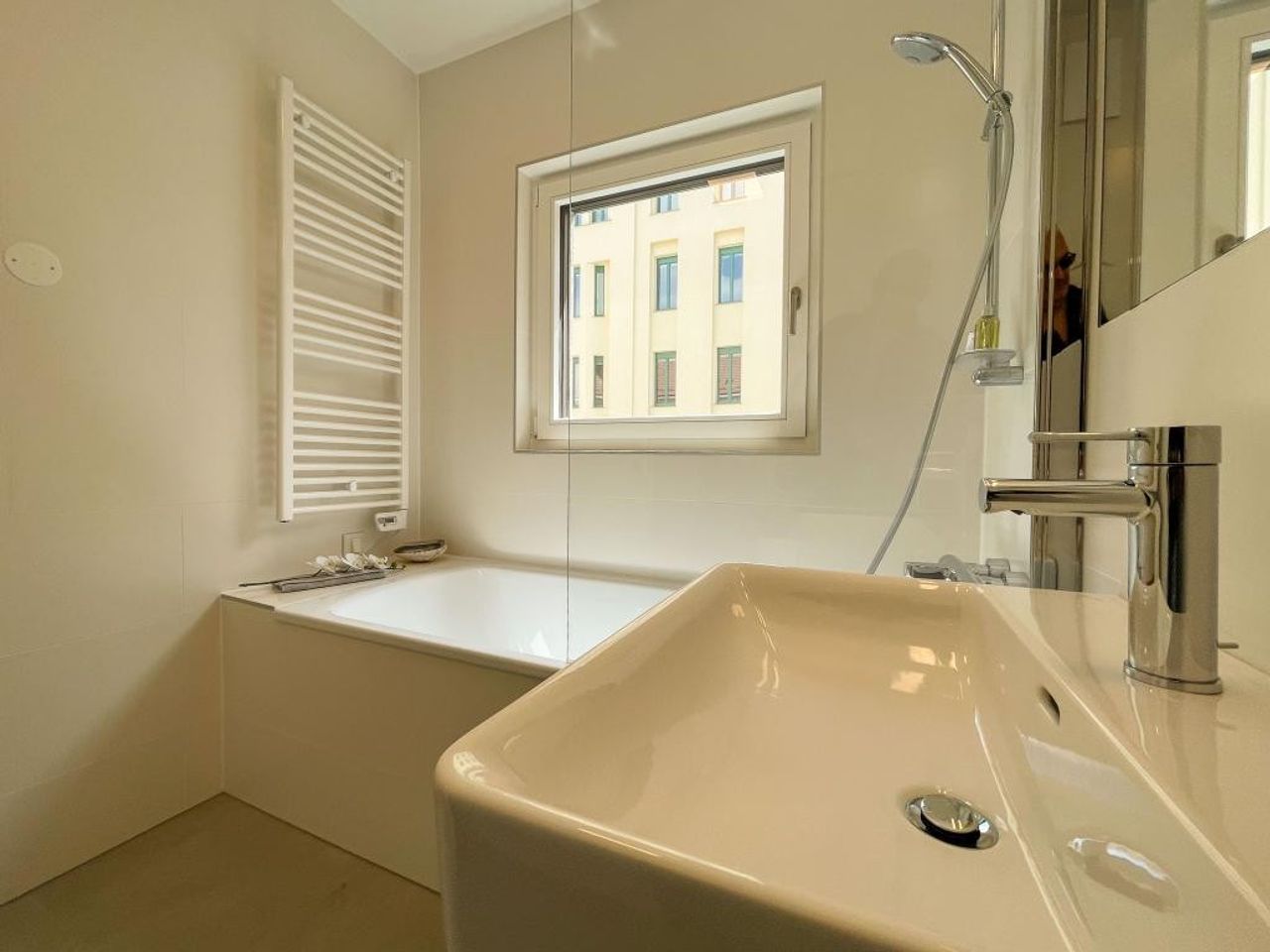 is 11m² in size and has a 3m² dressing area separated by a partition immediately after the entrance, as well as an en suite bathroom with bathtub, shower partition, sink with under cabinet, towel dryer and WM connection. In front of the window you will also find fixed planter boxes.