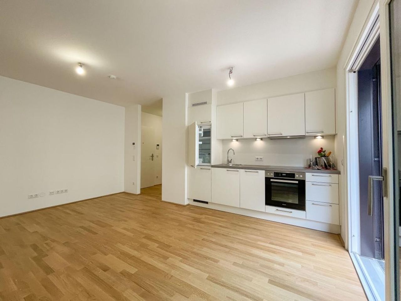 ist gut 20 m² groß und verbindet sich fließend mit dem 4,43m² Vorraum. Über eine Front von knapp 3 m steht eine nagelneue Küche mit Ober- und Unterschränke und LED Beleuchtung der Arbeitsfläche, 4-flammiges Ceranfeld und Backofen, Dunstabzug mit Beleuchtung des Kochfeldes, Geschirrspüler sowie ein Kühlschrank mit Gefrierfach. Alle Geräte sind von Miele. Ein sonniger 3m² Balkon schließt an das Wohnzimmer straßenseitig an.Pflanzkisten sind bereits in das Geländer integriert und ein Wasseranschluß ist ebenfalls vorhanden.