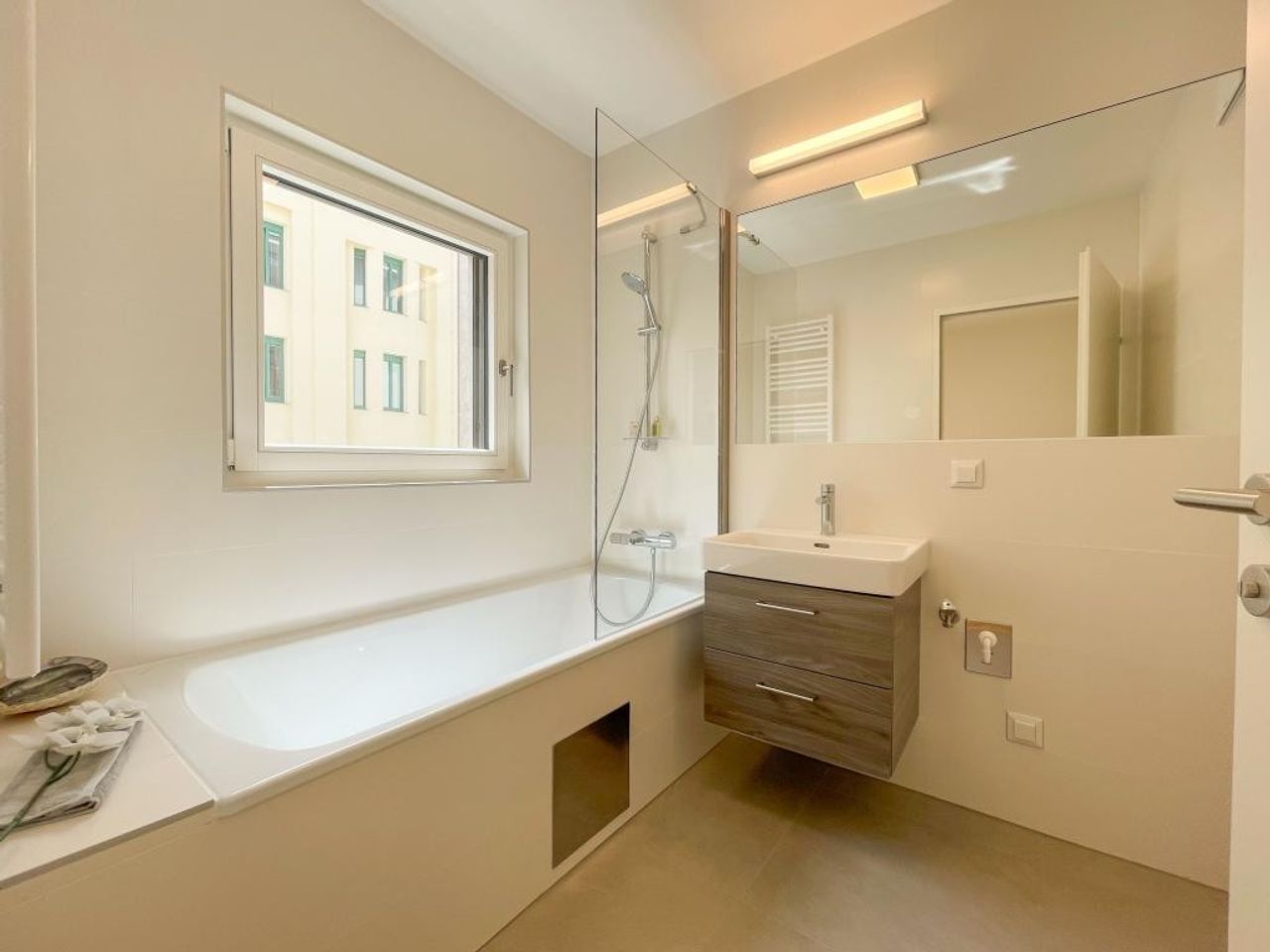 is a good 20 m² in size and connects smoothly with the 4.43m² anteroom. Over a frontage of just under 3m stands a brand new kitchen with upper and lower cabinets and LED lighting of the worktop, 4-burner ceramic hob and oven, extractor fan with lighting of the hob, dishwasher and a refrigerator with freezer compartment. All appliances are from Miele. A sunny 3m² balcony connects to the living room on the street side.planting boxes are already integrated into the railing and a water connection is also available.