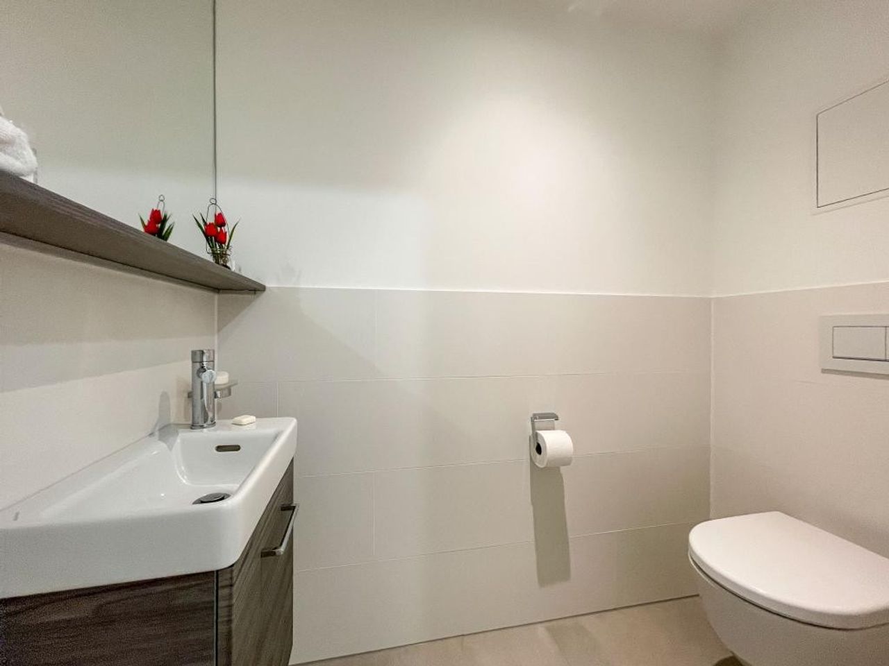 ist 11m² groß und verfügt gleich nach dem Eingang über einen 3m² durch eine Trennwand abgesonderten Ankleidebereich, sowie über ein en Suite Bad mit Badewanne, Duschtrennwand, Waschbecken mit Unterbauschrank, Handtuchtrockner und WM-Anschluss. Vor dem Fenster findet man ebenfalls fixierte Pflanzkisten vor.