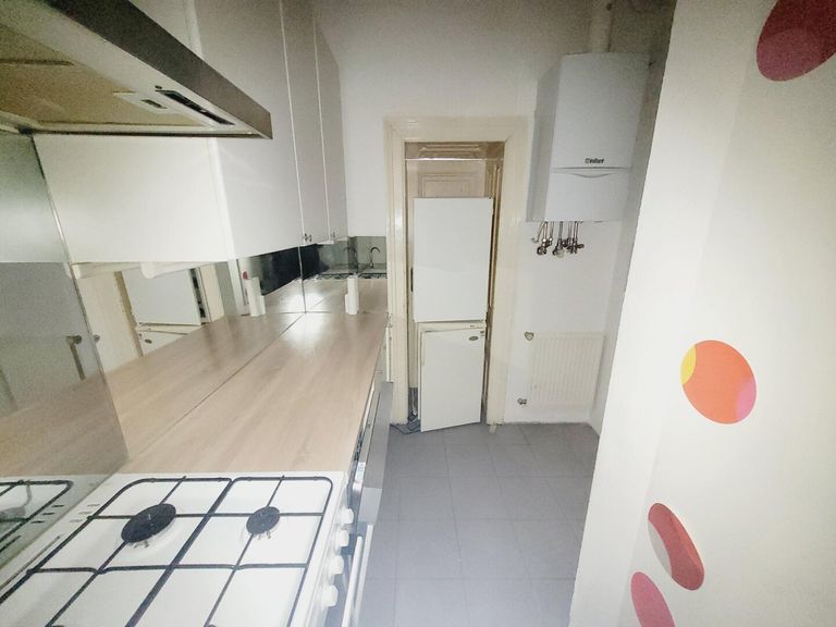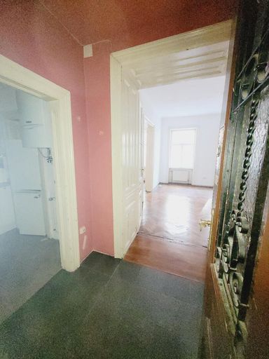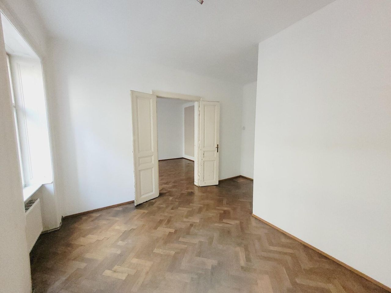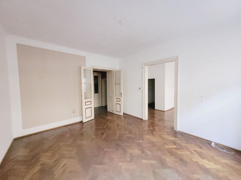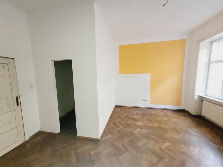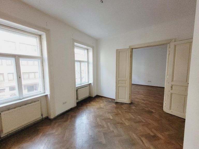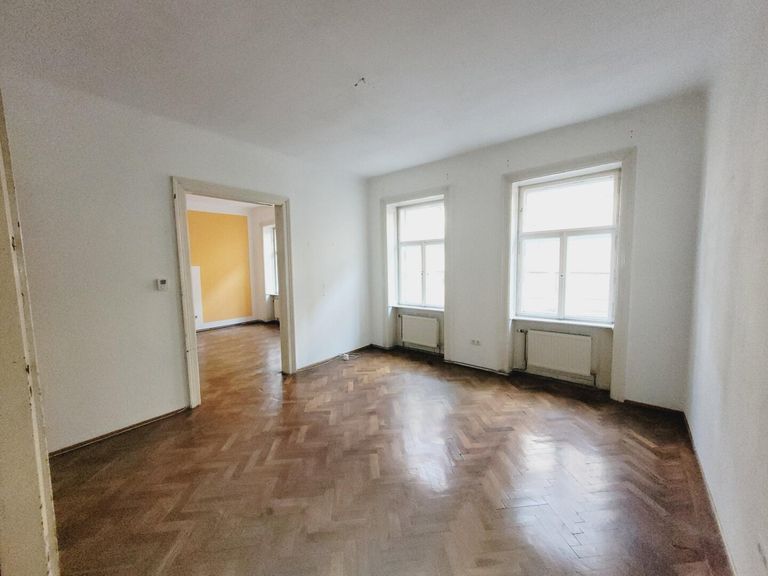 Man betritt die Wohnung über den Vorraum. Linkerhand befindet sich die Küche, eingerichtet mit einer Einbauküche und einer Oberlichte auf den Gang. Von hier führt eine Tür in das kleine Badezimmer, eingerichtet mit einer Dusche. Im Vorraum geradeaus gelangt man ins das erste Zimmer. Von hier führt eine schöne Flügeltür in das zweite Zimmer. Von der Küche gab es einen Durchgang in das zweite Zimmer. Dieser Durchgang könnte reaktiviert werden. Derzeit ist die Tür durch den Kühlschrank verstellt. Im zweiten Zimmer befindet sich ein abgetrennter begehbarer Schrankraum. Beide Zimmer sind südseitig auf die Westbahnstraße ausgerichtet und haben schöne alte Holzböden. Das separate WC ist vom Vorrauch erreichbar.