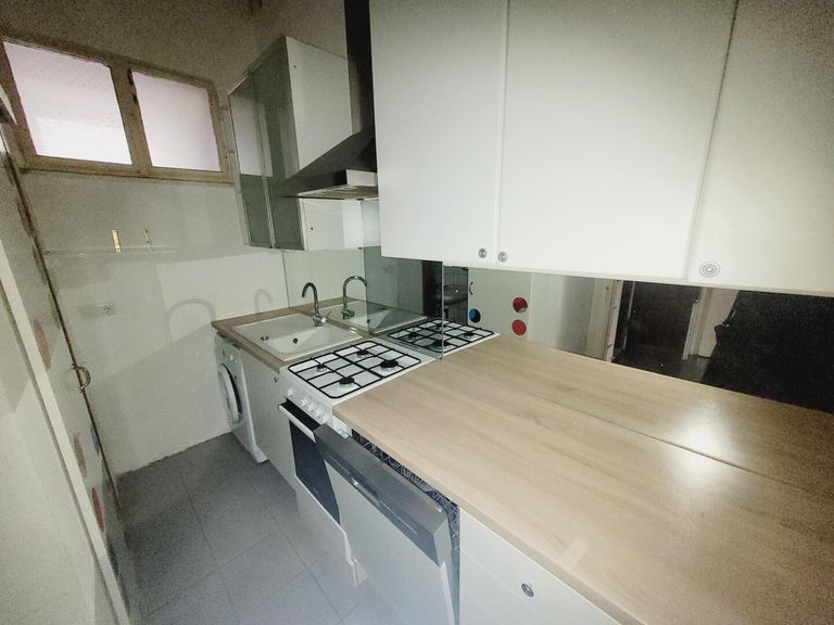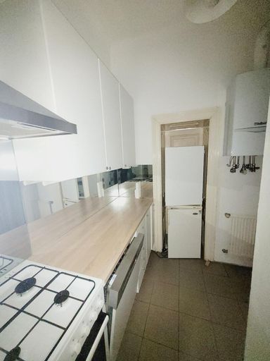 Man betritt die Wohnung über den Vorraum. Linkerhand befindet sich die Küche, eingerichtet mit einer Einbauküche und einer Oberlichte auf den Gang. Von hier führt eine Tür in...