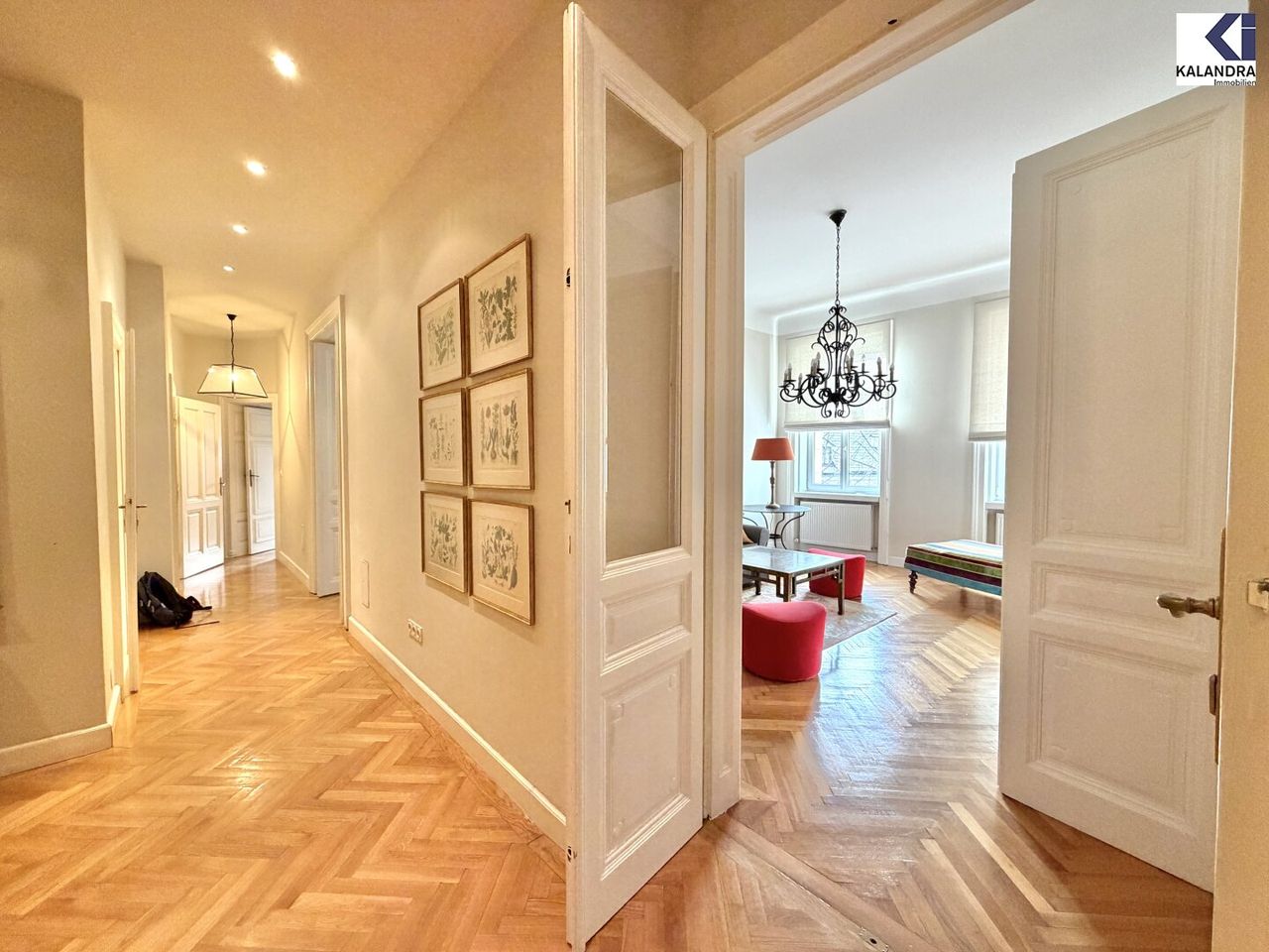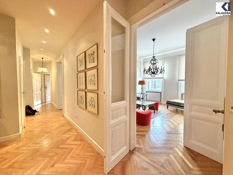 großes, zentrales Vorzimmer, zwei Wohnsalons, 2 große Schlafzimmer, Küche mit Eßplatz, großes Wannenbad mit WC, Duschbad, separates WC.