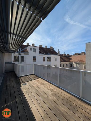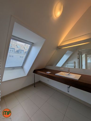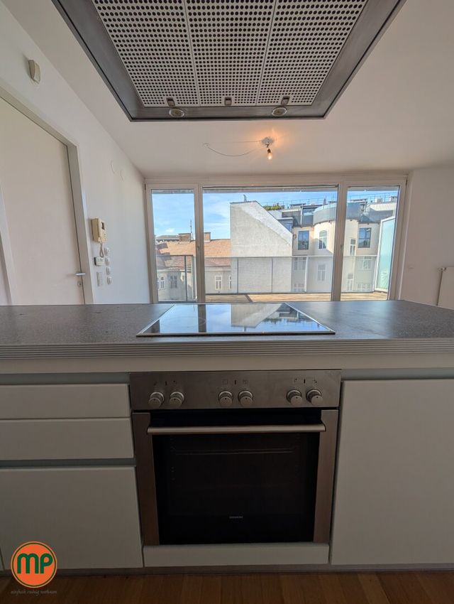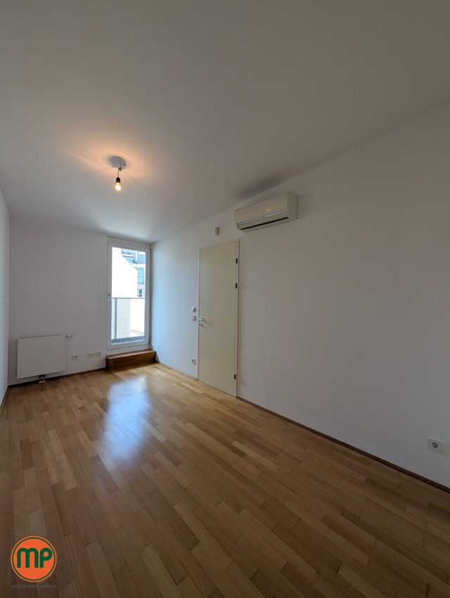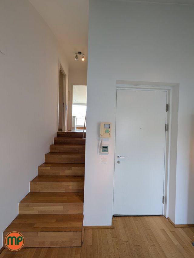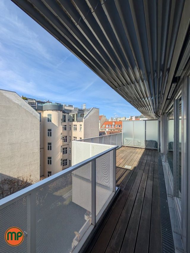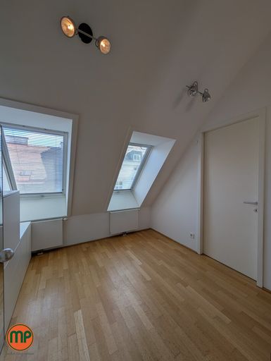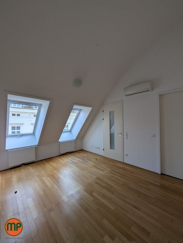 Selten gibt es Wohnungen mit so viel Tageslicht. Die Dachfenster auf der einen Seite und die großflächigen Terrassenfenster auf der anderen Seite schaffen zusammen mit den hellen Holzböden eine einmalig heimelige Atmosphäre. Auf der unteren Ebene finden Sie neben Vorzimmer und tageslichtverwöhntem Schlafzimmer, einen großen Abstellraum, sowie das erste Badezimmer. Dieses Badezimmer ist mit einer Wanne ausgestattet und schafft durch die Holzelemente und den großen Spiegel eine sehr elegante Stimmung. Aus dem Vorzimmer führte Sie die Holztreppe zunächst in das zweite Badezimmer mit Dusche und Klo und weiter in die großräumige Wohnküche. Dank den enormen Fensterflächen empfängt Sie dieser Raum mit einer unglaublich einladenden Stimmung. Die praktische Kochinsel und die Aussicht werden Sie nachhaltig beeindrucken. Von hier aus treten Sie auch auf Ihre Dachterrasse, welche in den absolut ruhigen Innenhof ragt und keine Wünsche offenlässt. Zu guter Letzt befindet sich noch das zweite Schlafzimmer auf dieser Ebene, welches – wie alle Wohnräume – mit einer modernen Klimaanlage ausgestattet ist. Für zusätzlichen Stauraum sorgt das großzügige, trockene Kellerabteil.