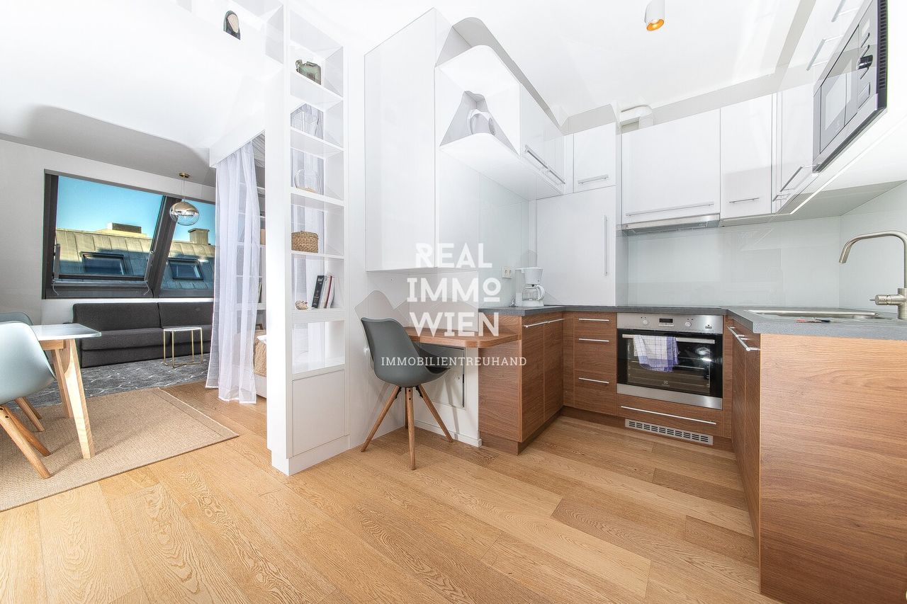 - Voll Ausgestatte Küche inkl. Kühlschrank, Gefrierschrank, Induktionsceranfeld, Dunstabzug, Backrohr, Mikrowelle und Geschirrspüler