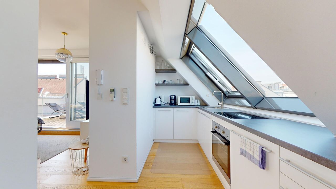 - Voll Ausgestatte Küche inkl. Kühlschrank, Gefrierschrank, Induktionsceranfeld, Dunstabzug, Backrohr, Mikrowelle und Geschirrspüler