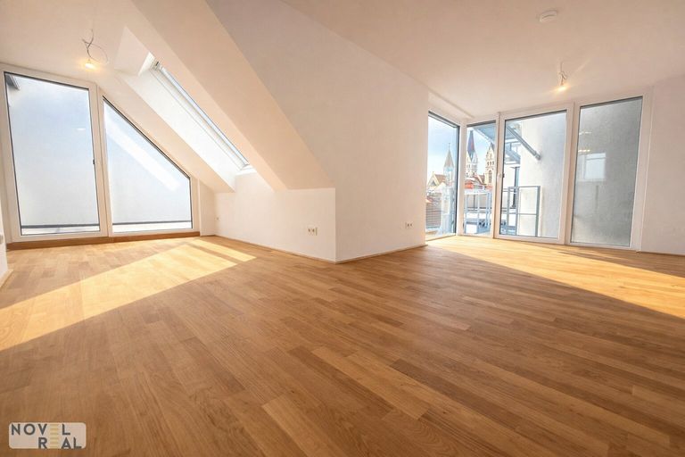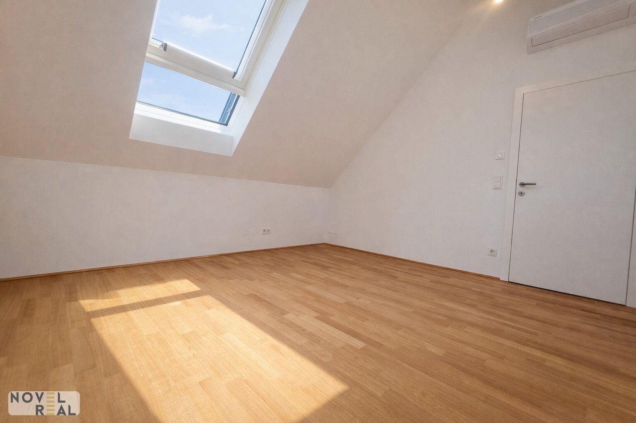 Großzügige Wohnräume mit edlen Holzböden und weitläufigen Fensterfronten schaffen eine helle und einladende Atmosphäre, während die modernen Dachschrägen den Räumen Charakter und Behaglichkeit verleihen.