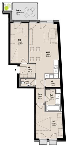 Die rund 70 m² große Wohnung gliedert sich in eine großzügige Wohnküche, ein Schlafzimmer, ein separates WC sowie ein hochwertig ausgestattetes Badezimmer.
