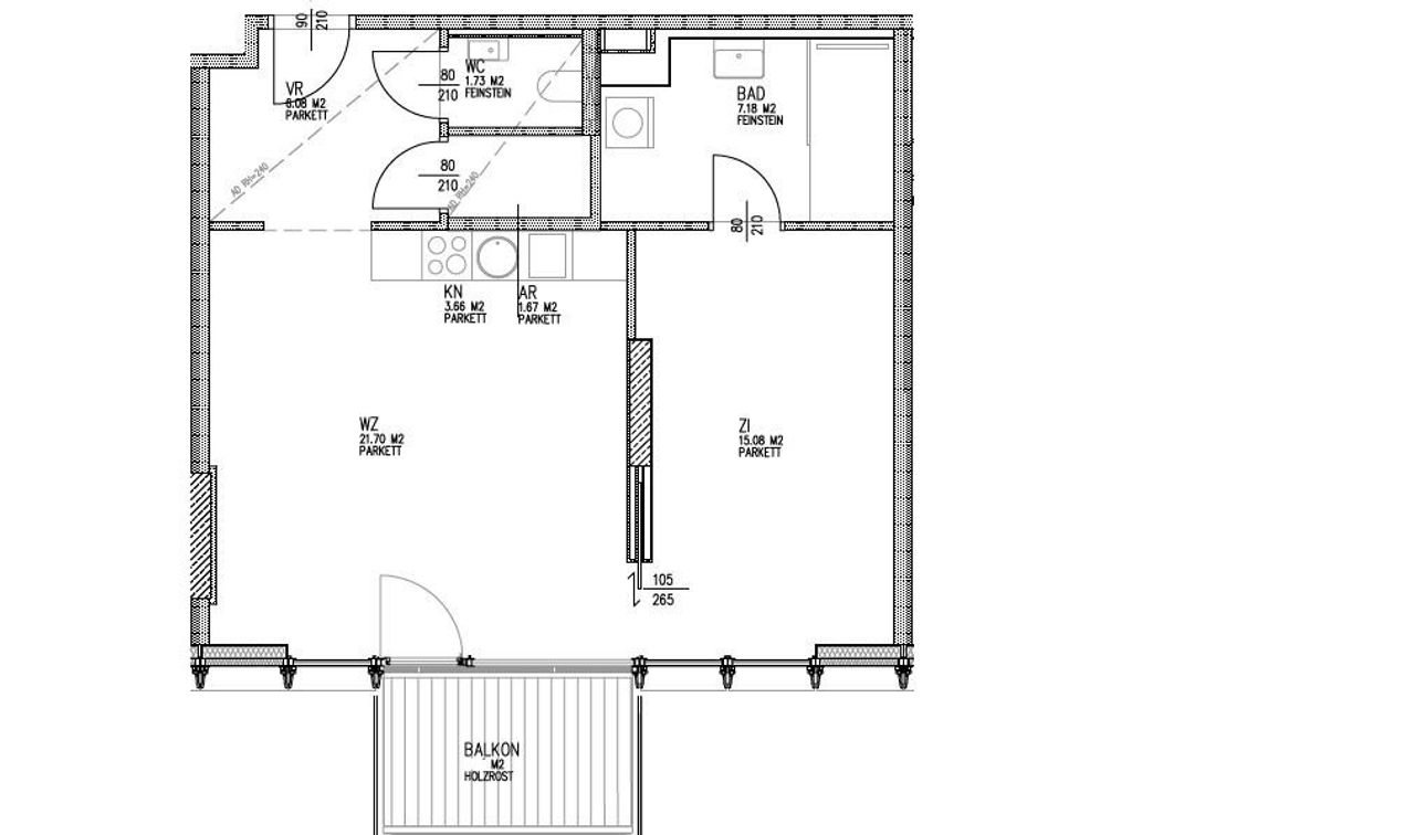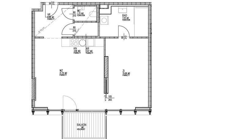 Vorraum, Wohnküche mit Balkon, Schlafzimmer, Badezimmer, WC, Abstellraum