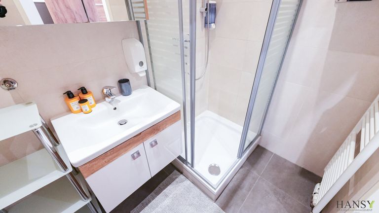 Badezimmer: Modernes Bad mit Dusche, WC und Waschbecken – kompakt und funktional.