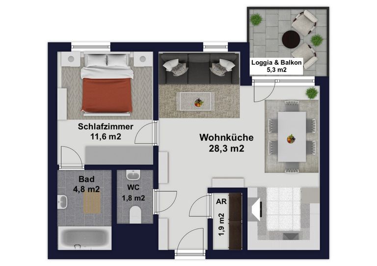 Wohnküche / Wohnzimmer mit Zugang zur Loggia (28,30 m²)