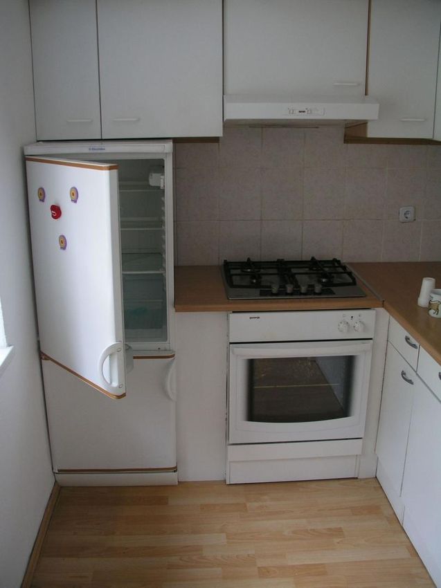 Moderne Einbauküche. Bad mit Dusche.