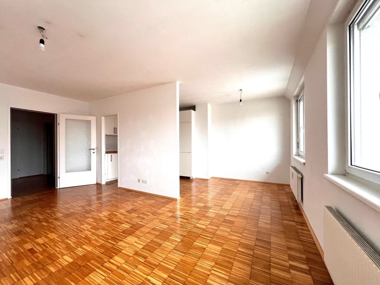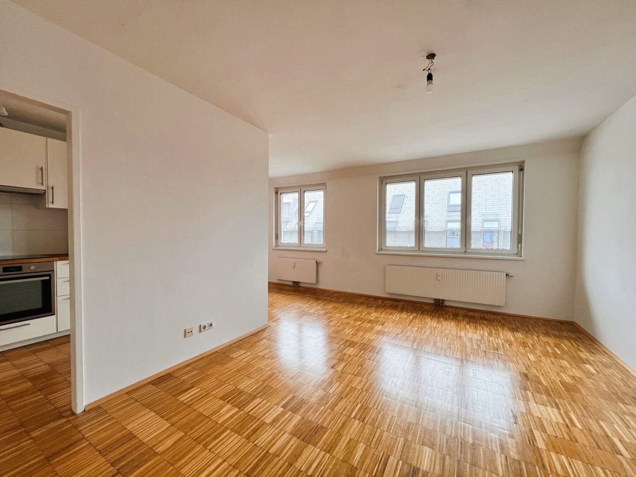 - 1 Wohnzimmer mit optisch getrennte Einbauküche und genügend Platz für einen Esstisch