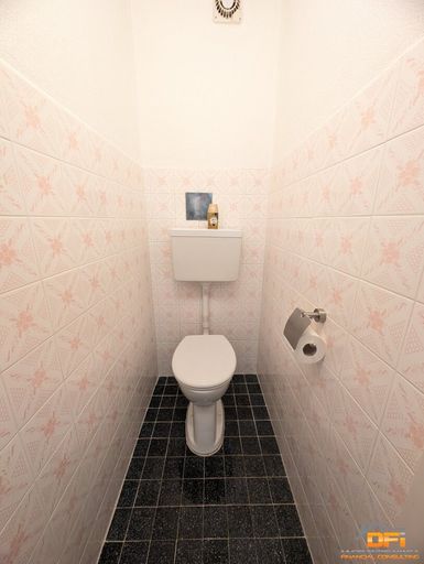 Die Toilette ist klassisch verfliest und räumlich vom Badezimmer getrennt.