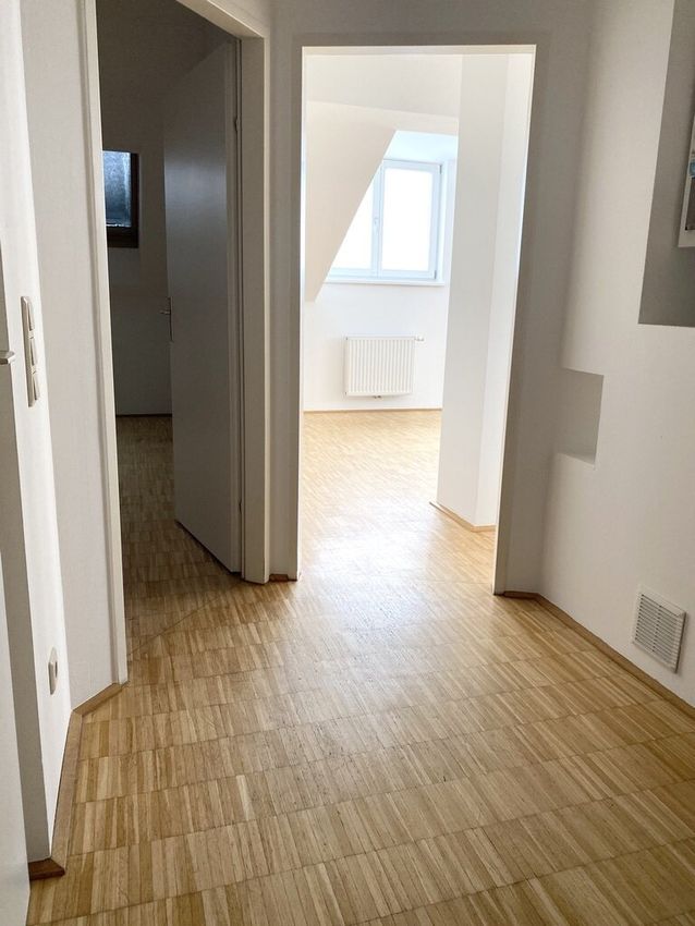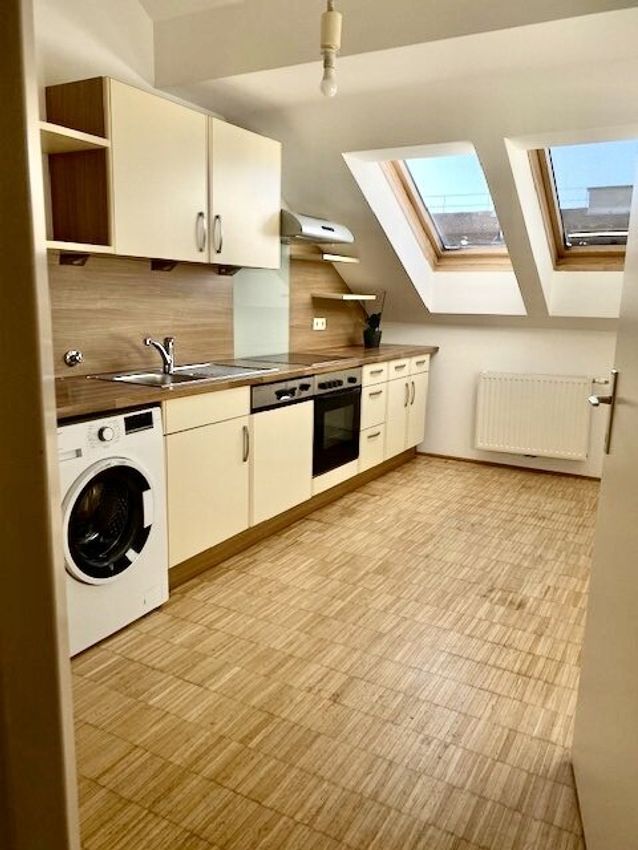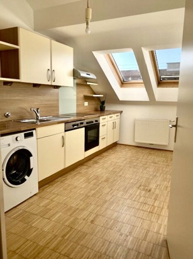 Sonnige Dachgeschosswohnung in sehr guter Lage: 2 Zimmer (dabei ein großes Wohnzimmer mit vielen Fenstern) + Küche, Nähe U1-Keplerplatz und Waldmüllerpark!