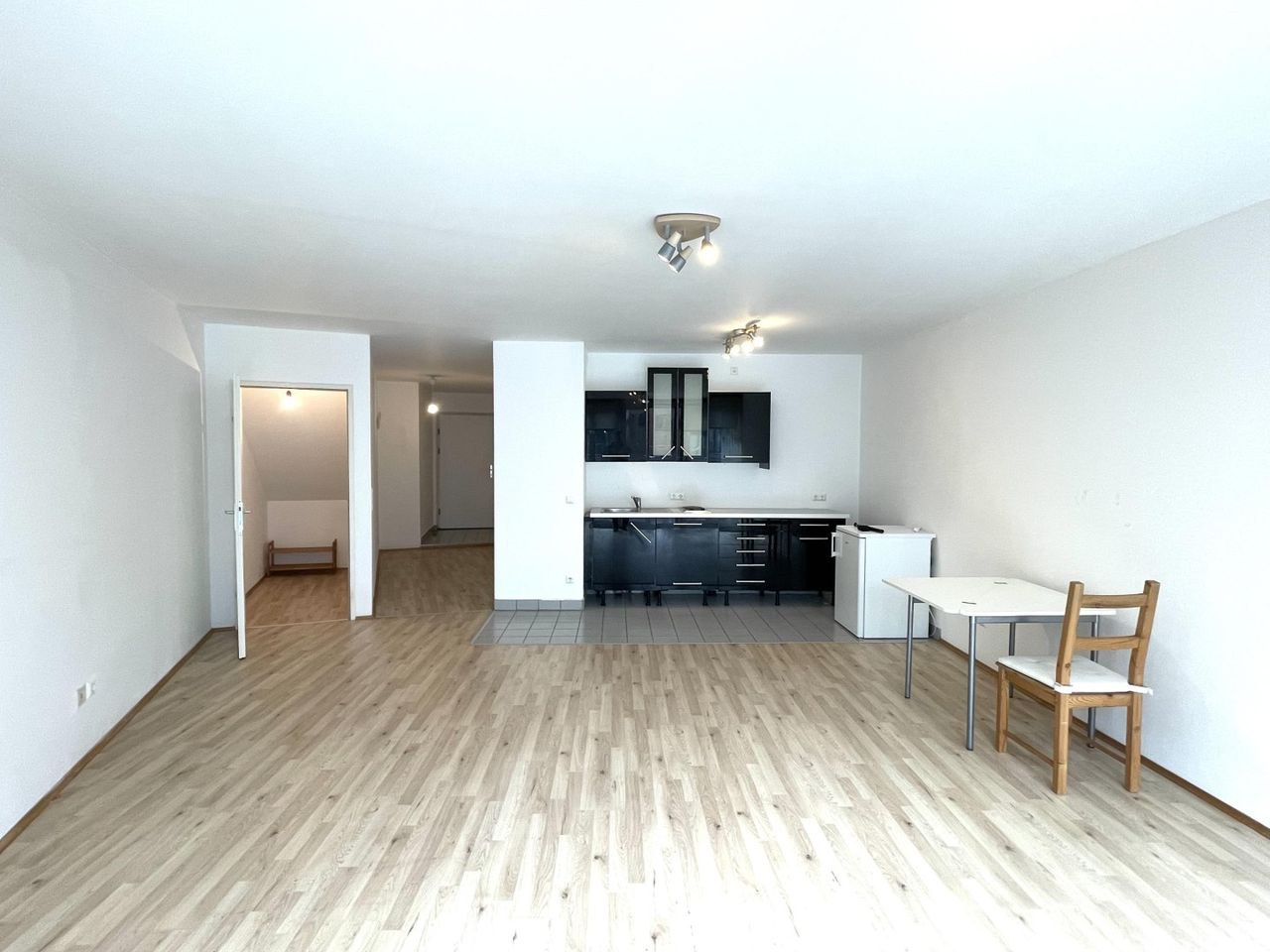 Der großzügige Wohn- und Schlafbereich mit integrierter Kochnische bietet genügend Platz und lässt sich flexibel gestalten – egal ob schlicht oder modern eingerichtet.