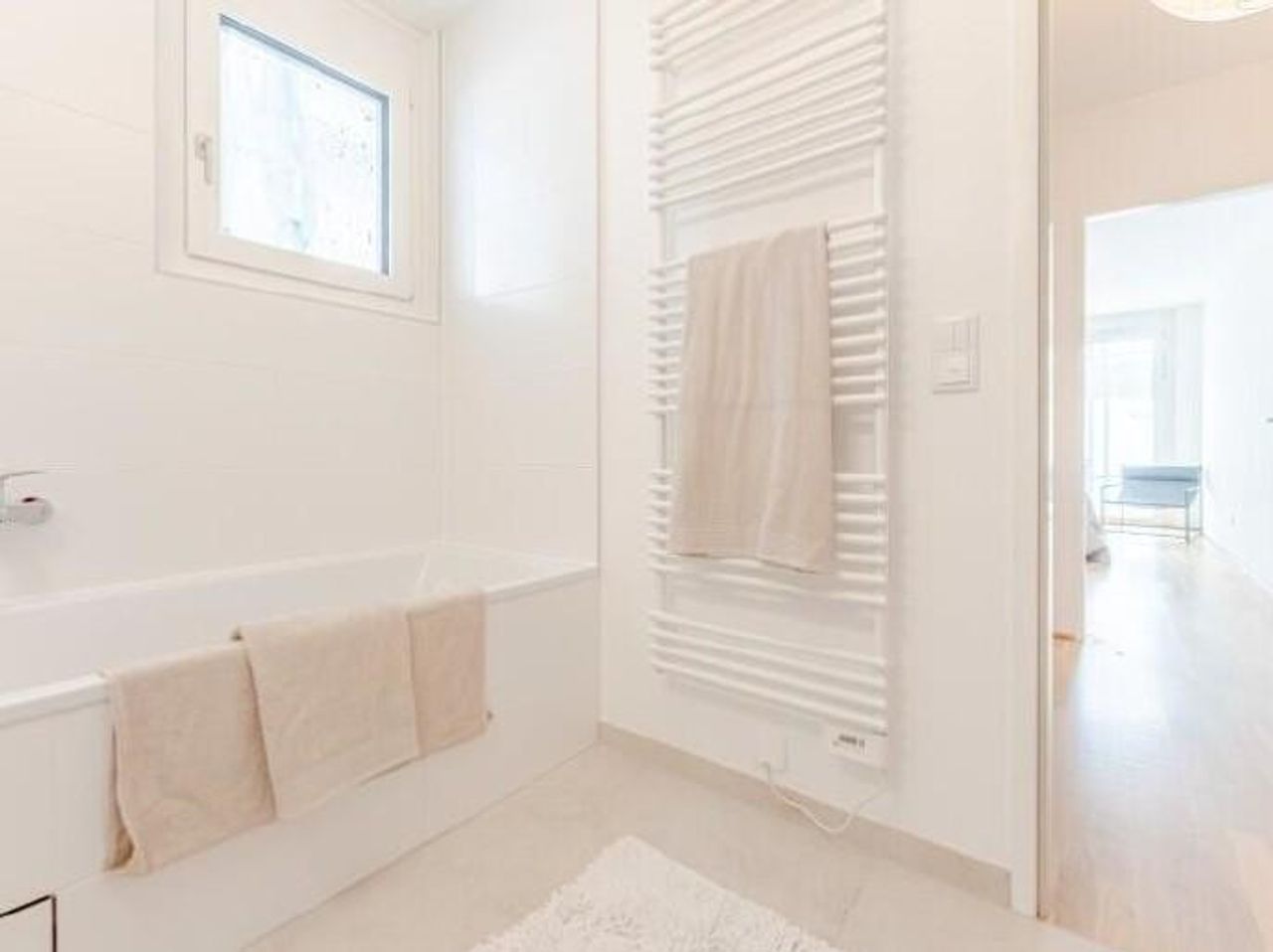 • Bad mit Badewanne, Duschglas, Waschbecken und Handtuchtrockner