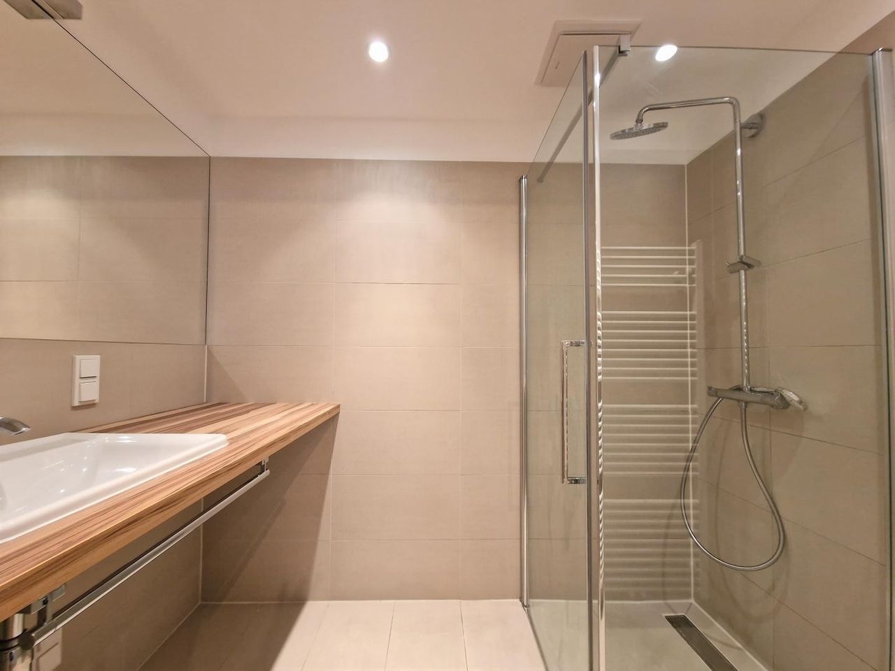 • Badezimmer mit großer Dusche, Waschbecken und Waschmaschinenanschluss