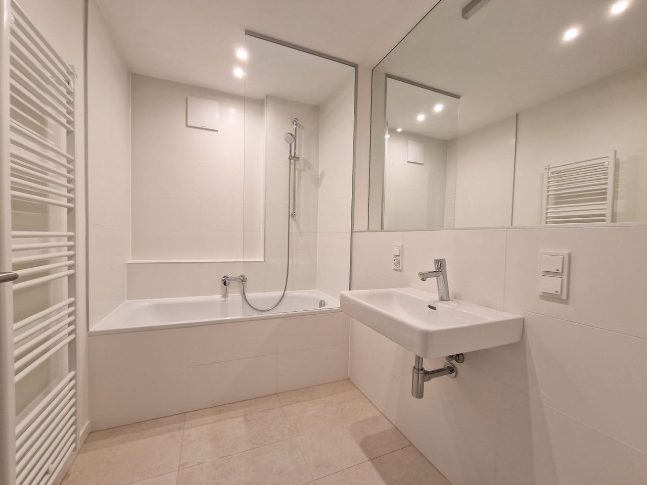 • Bad mit Badewanne und Duschverglasung, Waschbecken und Handtuchtrockner