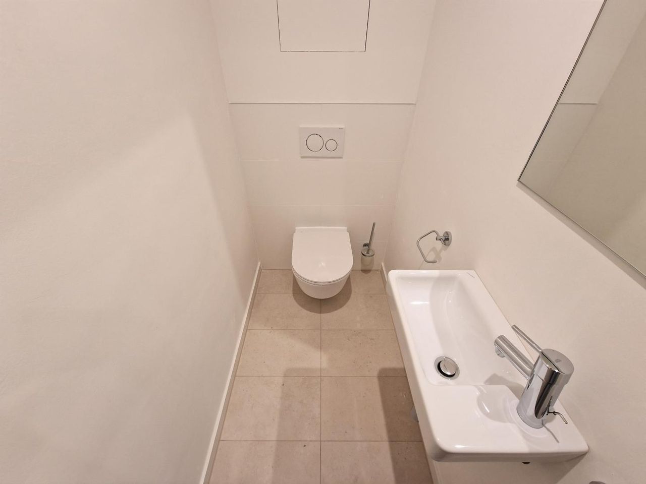 • große Kacheln (30x60 Feinsteinzeug) und Markenarmaturen im Bad und WC