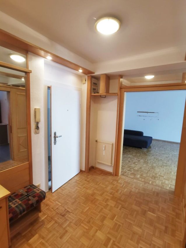 geräumiges Vorzimmer, Schlafzimmer (Grünblick), Bad mit Badewanne, Toilette separat, Küche (möbliert), Wohnzimmer mit Austritt auf die Loggia (Richtung Südost);