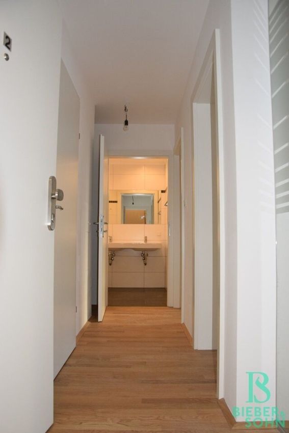 Durch die terrassierte Bauweise befindet sich die Wohnung von der Strassenseite aus im 1. Stock, die mit dem Lift barrierefrei zu erreichen ist. Vom Vorraum aus ist der große Wohnraum mit der exklusiven Küche und den bodentiefen Fenstern zu betreten und weiterführend in ein Zimmer, ein weiteres Zimmer vom Vorraum aus, ein Bad mit Wanne, Waschtisch und Wanne und ein separates WC mit Handwaschbecken. Für die Waschmaschine und Trockner ist eine eigene Nische vorgesehen.