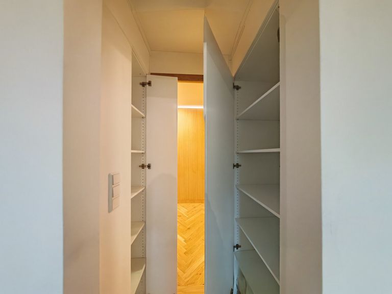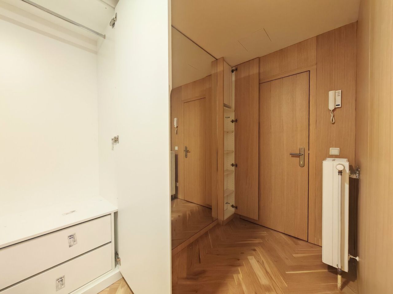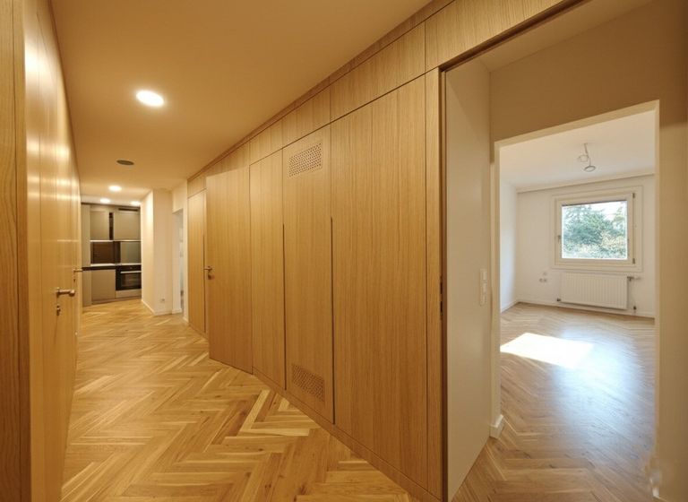 Diese Wohnung wurde kürzlich umfassend und stilvoll in modernem Design renoviert. Das gesamte Vorzimmer ist mit Holzvertäfelung ausgestattet, wodurch Zimmertüren und Stauraumlösungen harmonisch in die Wandgestaltung integriert werden. Dies sorgt für ein hochwertiges und zugleich wohnliches Ambiente. Die Raumaufteilung ist besonders effizient: Es wurden Garderoben sowie separate Schränke für Therme und Waschmaschine geschaffen, um jeden Quadratmeter optimal zu nutzen.