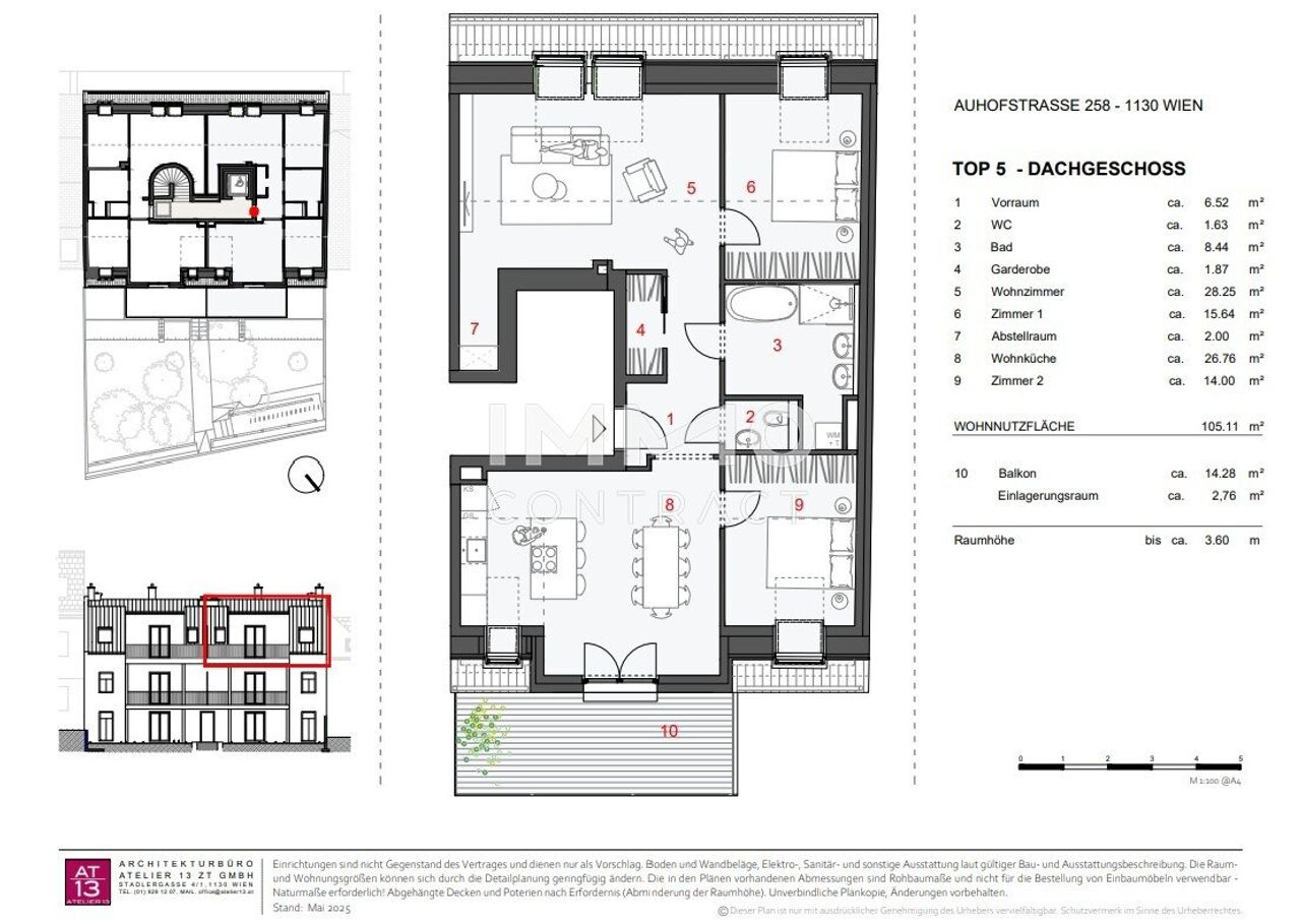 Auf rund 105,11 m² Wohnfläche entfaltet sich ein durchdachtes Raumkonzept mit beeindruckender Großzügigkeit. Die 26,76 m² große Wohnküche bildet das kommunikative Zentrum der Wohnung, während das separate 28,25 m² Wohnzimmer mit seiner außergewöhnlichen Raumhöhe von ca. 3,60m ein repräsentatives Ambiente schafft – lichtdurchflutet, elegant und architektonisch eindrucksvoll.