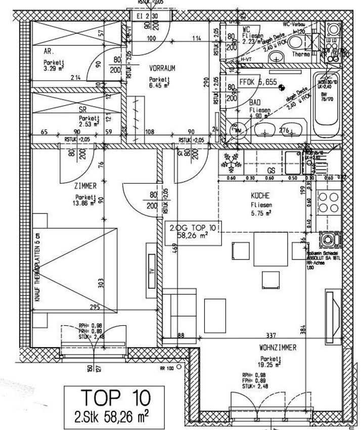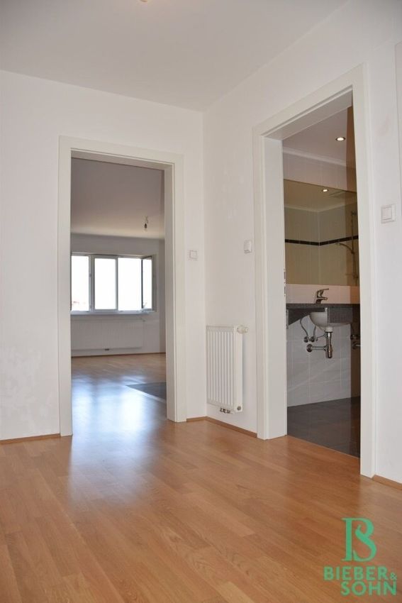 Im 2. Liftstock, auf einer Wohnfläche von 58,26m² sind ein großzügiger Vorraum, ein Wohnraum mit offen gehaltener Miele-Küche, ein Zimmer mit begehbarer Garderobe, ein Bad mit Wanne, Doppelwaschtisch und Waschmaschinenanschluß, ein separates WC mit Handwaschbecken und ein großer Abstellraum vorhanden.