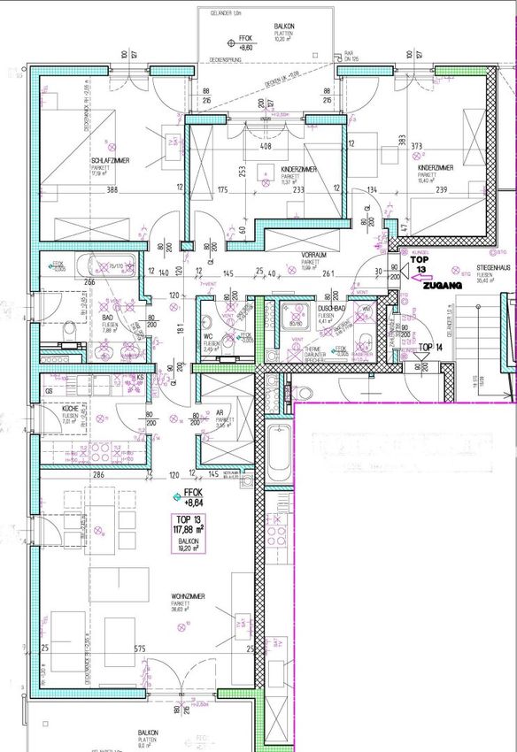 Im 3. Obergeschoss mit Lift gelegen, stehen ein Vorraum, 3 Zimmer, davon 2 Räume mit Ausgang auf eine ca. 9m² große Terrasse, das große Wohnzimmer mit Ausgang auf die ca. 10m² messende Süd-Terrasse, eine komplett eingerichtete Miele-Küche, ein Bad mit Wanne, Doppelwaschtisch und WC, ein Bad mit Dusche, ein separates WC und ein Abstellraum zur Verfügung.