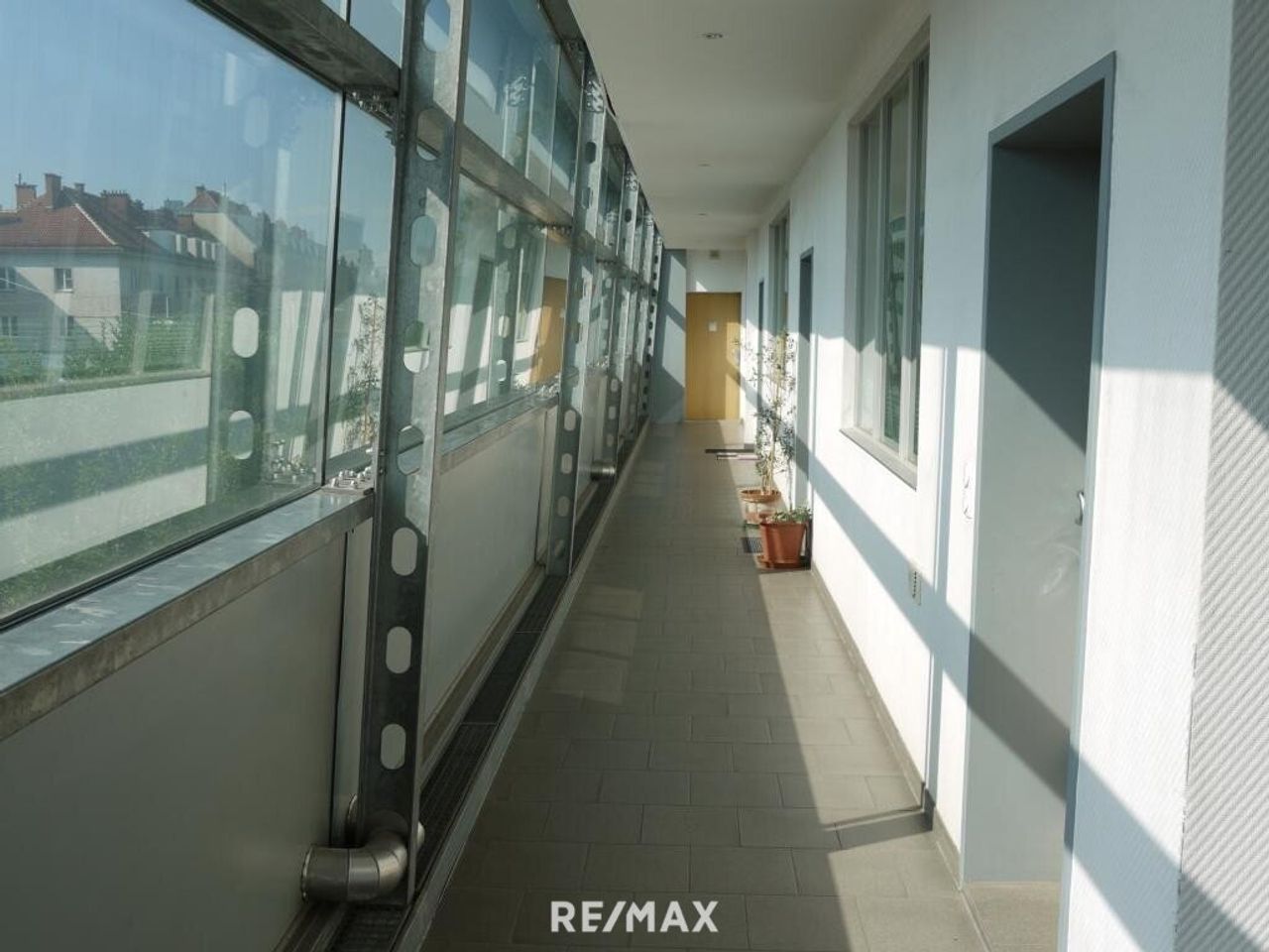 Über einen verglasten Gang, der aufgrund einiger Blumenstöcke, die von den Bewohnern dort aufgestellt wurden, eine angenehme Frische vermittelt, gelangen wir in die Wohnung.