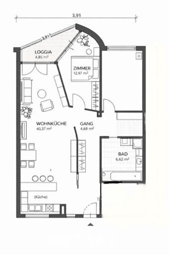 Ein großer Raum, der auch die offene Küche beinhaltet, führt bis zur gegenüberliegenden Seite der Wohnung, wo sich einer der beiden Ausgänge auf die Loggia befindet. Die Loggia zeigt in Richtung Westen in den großen Garten und somit direkt ins Grüne. Ruhe und die Möglichkeit sich von einem anstrengenden Arbeitstag erholen zu können sind hier garantiert!