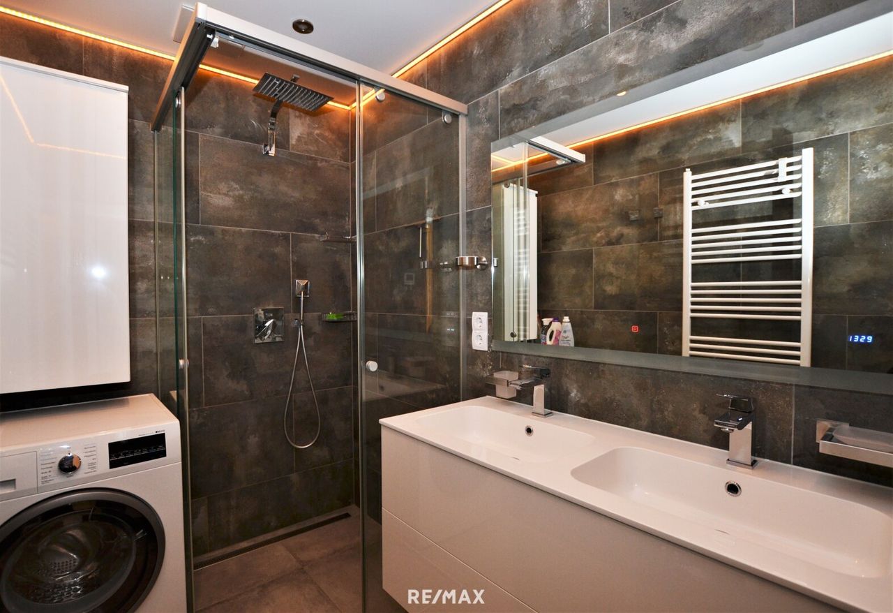 Das Badezimmer ist funktional gestaltet und mit einem Doppelwaschtisch, einer Walk-In Dusche sowie einer Waschmaschine am eigenen Waschmaschinenanschluss ausgestattet. Ein geräumiger Waschtischunterschrank bietet hier zusätzlichen Stauraum.