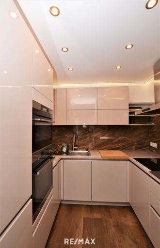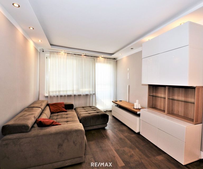 Das Wohnzimmer ist mit einer Couch und einer Wohnwand ausgestattet, während das Schlafzimmer über einen geräumigen Schrank verfügt. Die moderne Küche ist voll ausgestattet und beinhaltet sämtliche notwendigen Elektrogeräte: E-Herd, Backrohr, Geschirrspüler, Kühlschrank, Dunstabzug mit Abluft und Mikrowelle. Im Vorzimmer finden sich eine Garderobe sowie weitere Verstaumöglichkeiten, die für Ordnung im Eingangsbereich sorgen.
