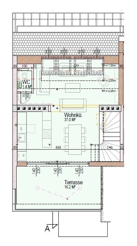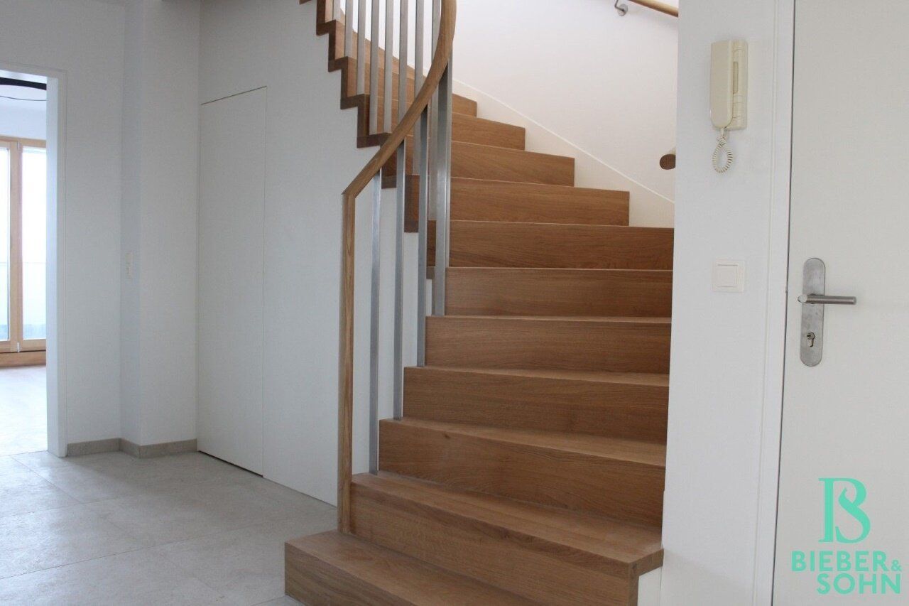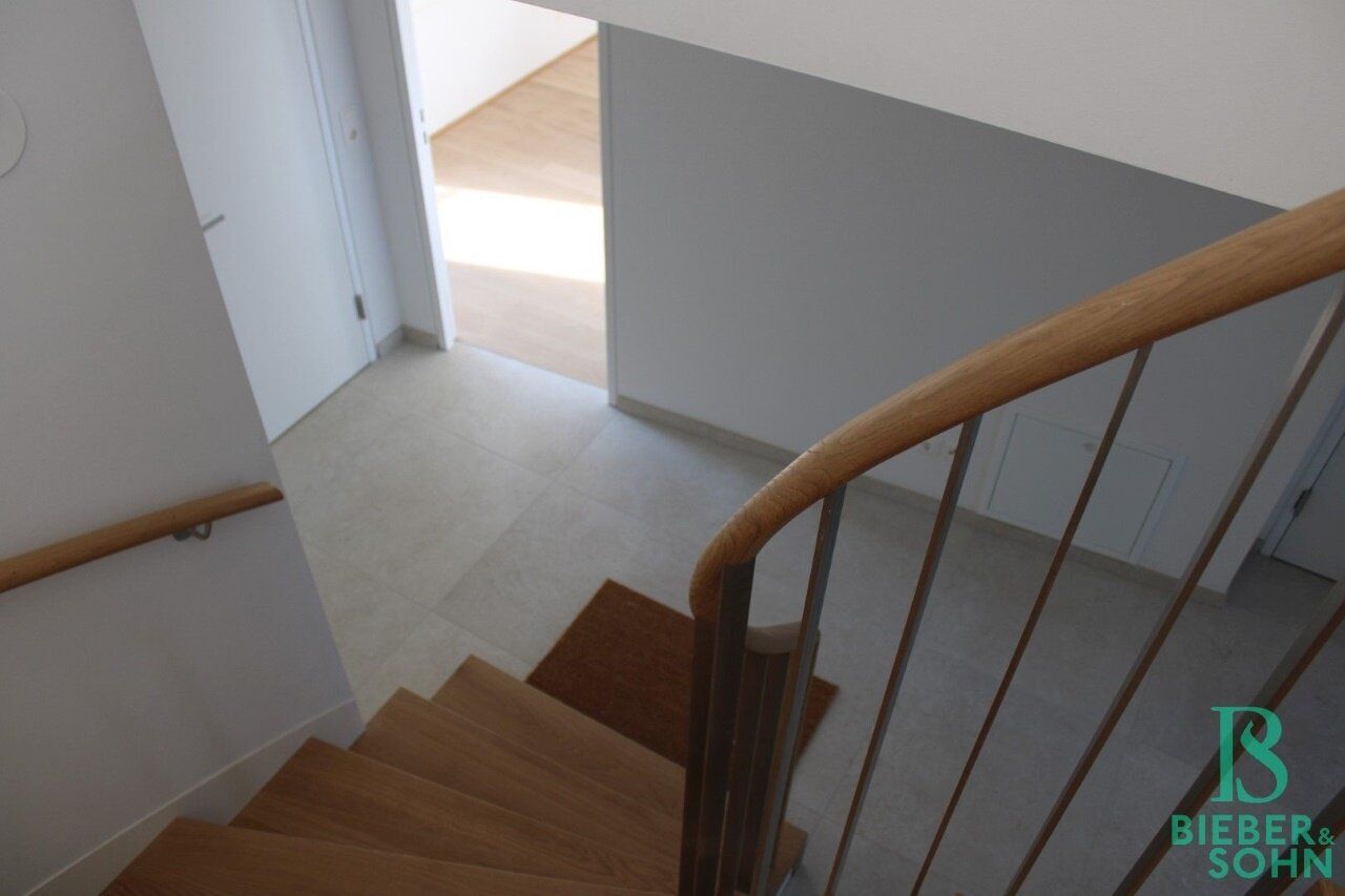 Vom Eingangsbereich aus sind 2 Schlafzimmer mit Ausgang auf die Terrasse, ein weiteres Zimmer mit Südbalkon, das Bad mit Wanne, ein separates WC, ein Abstellraum und der Aufgang in das Obergeschoss zu erreichen. Der geräumige und lichtdurchflutete Ess-/Küchenbereich mit Ausgang auf die großzügige, ca. 16m² große Südterrasse und das offen gehaltene Wohnzimmer befinden sich im Dachgeschoss sowie ein separates Gäste-WC.