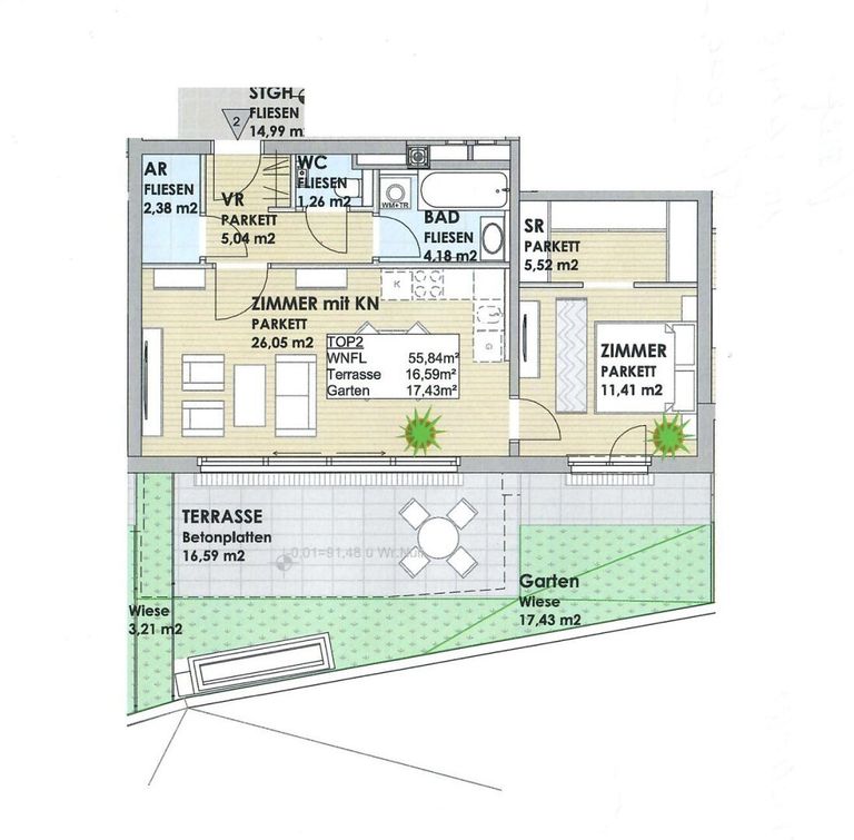 Die Wohnung hat eine Wohnfläche von 56 m2, ca. 17 m2 Gartenfläche und ca. 16 m2 Sonnenterrasse.