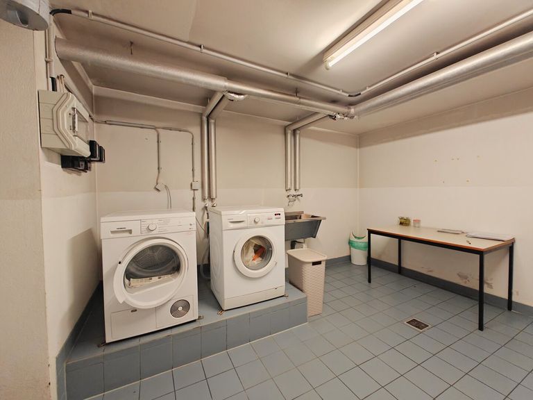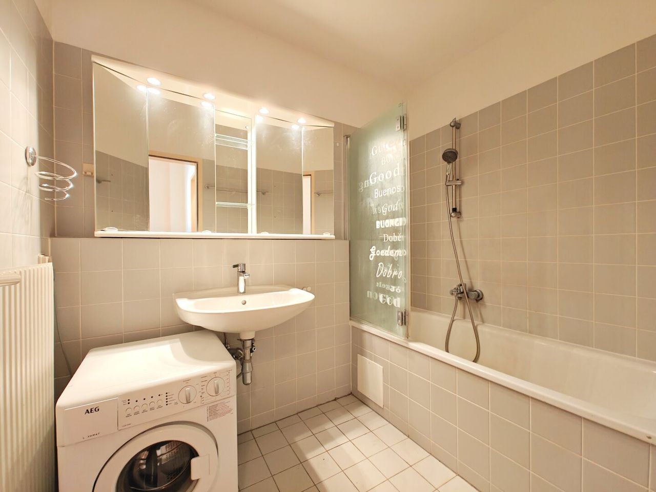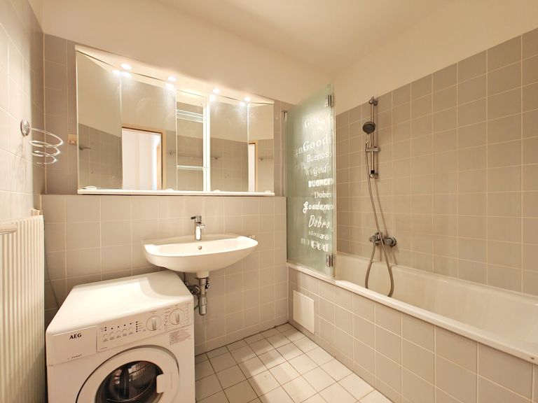 + Badezimmer mit Badewanne, Waschmaschine, Waschbecken und Spiegelschrank