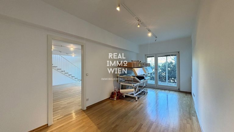 Im Erdgeschoss erwartet Sie ein großzügiger Wohnsalon mit Kamin und direktem Zugang zum Garten – ein idealer Ort für entspannte Stunden und gesellige Abende. Ergänzt wird dieser Bereich durch ein komfortables Schlafzimmer, eine begehbare Garderobe, die sich ebenso als Büro nutzen lässt, sowie ein stilvolles Badezimmer mit Whirlpool-Funktion.