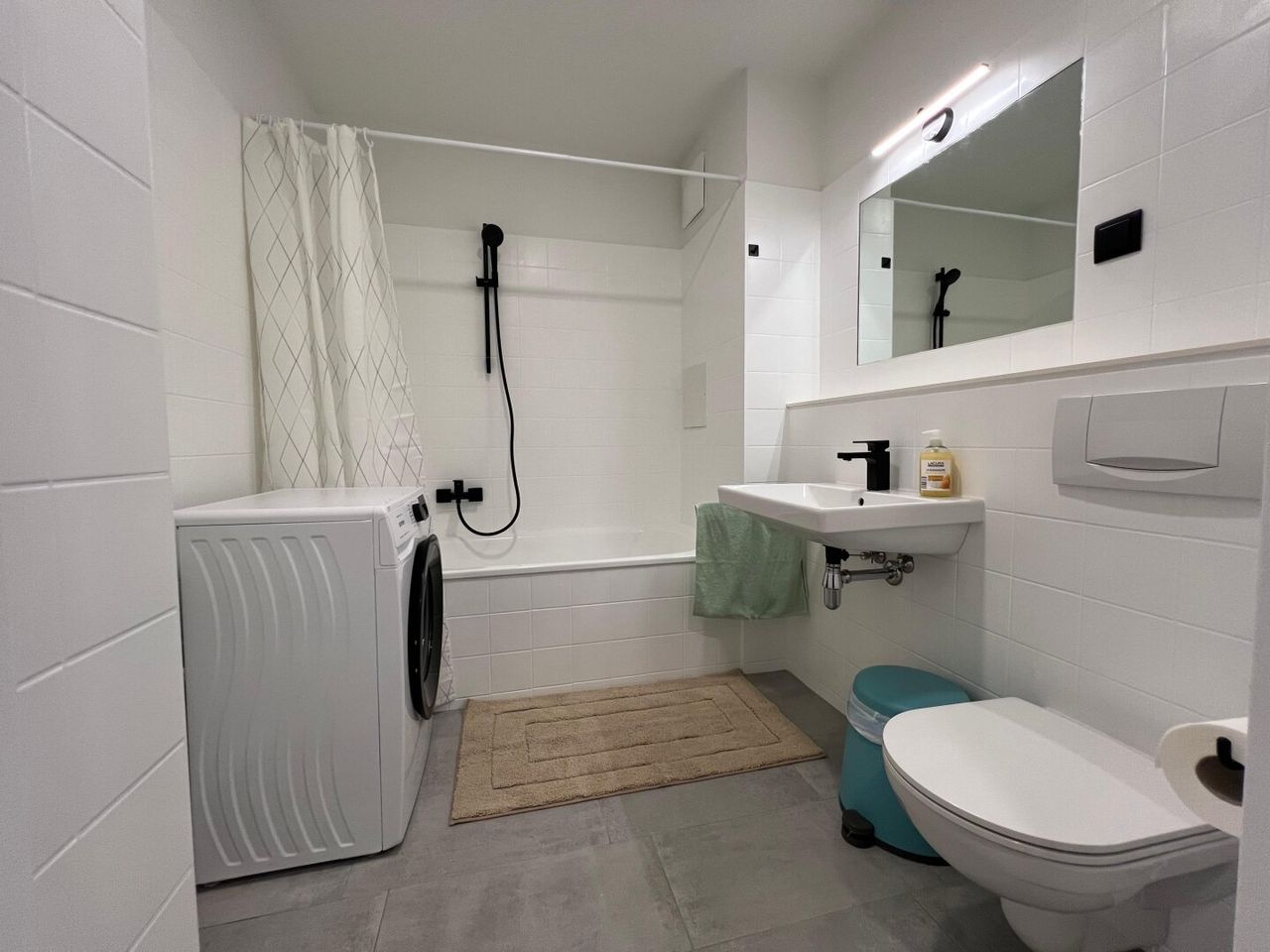 Neues Badezimmer mit WC, Waschbecken, hochwertigen Armaturen sowie Waschmaschine